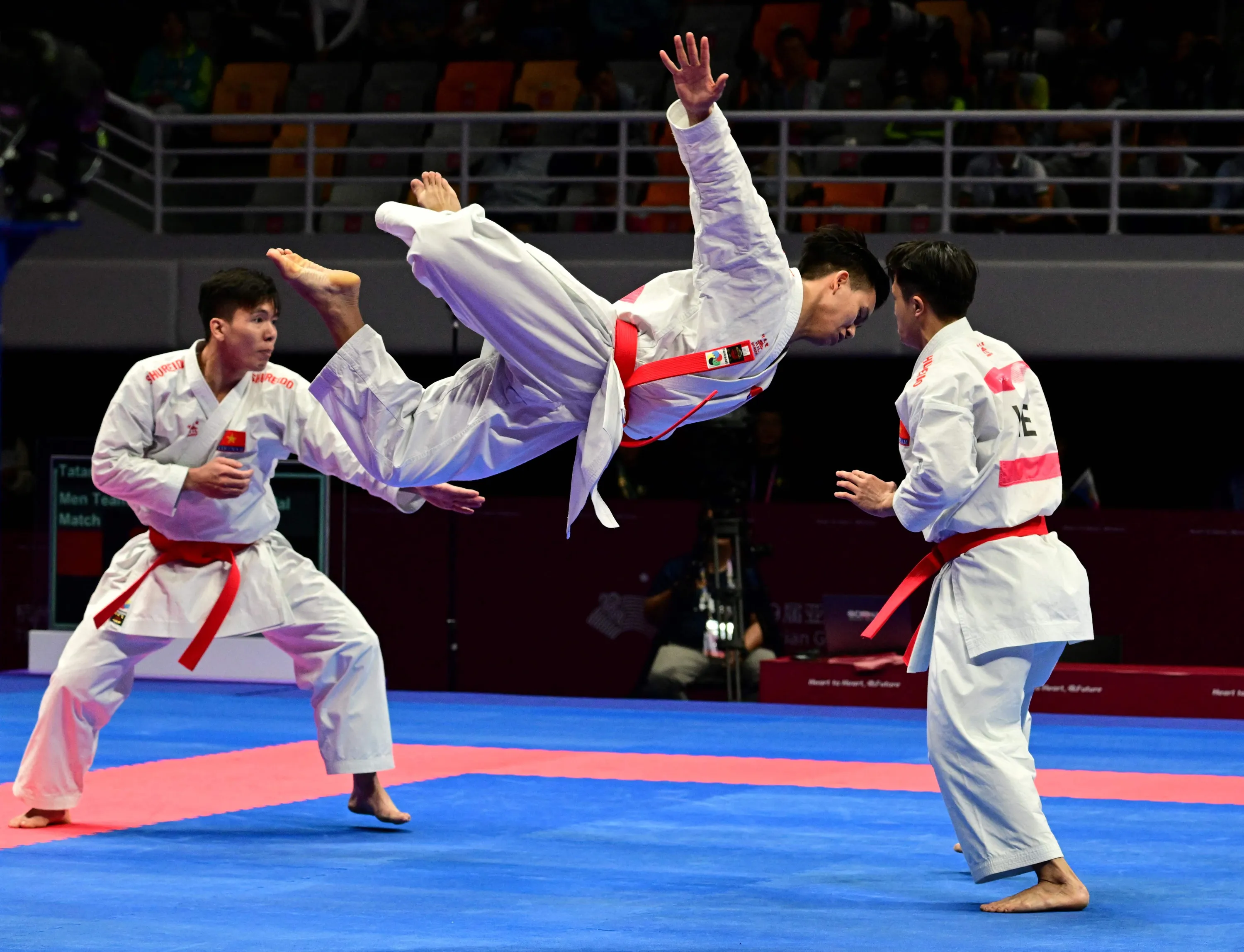 Vietnam's team performs in the men's team Karate event at the Hangzhou 2022 Asian Games in Hangzhou, in China's eastern Zhejiang province on October 8, 2023. (Photo by Ishara S. Kodikara/AFP Photo)