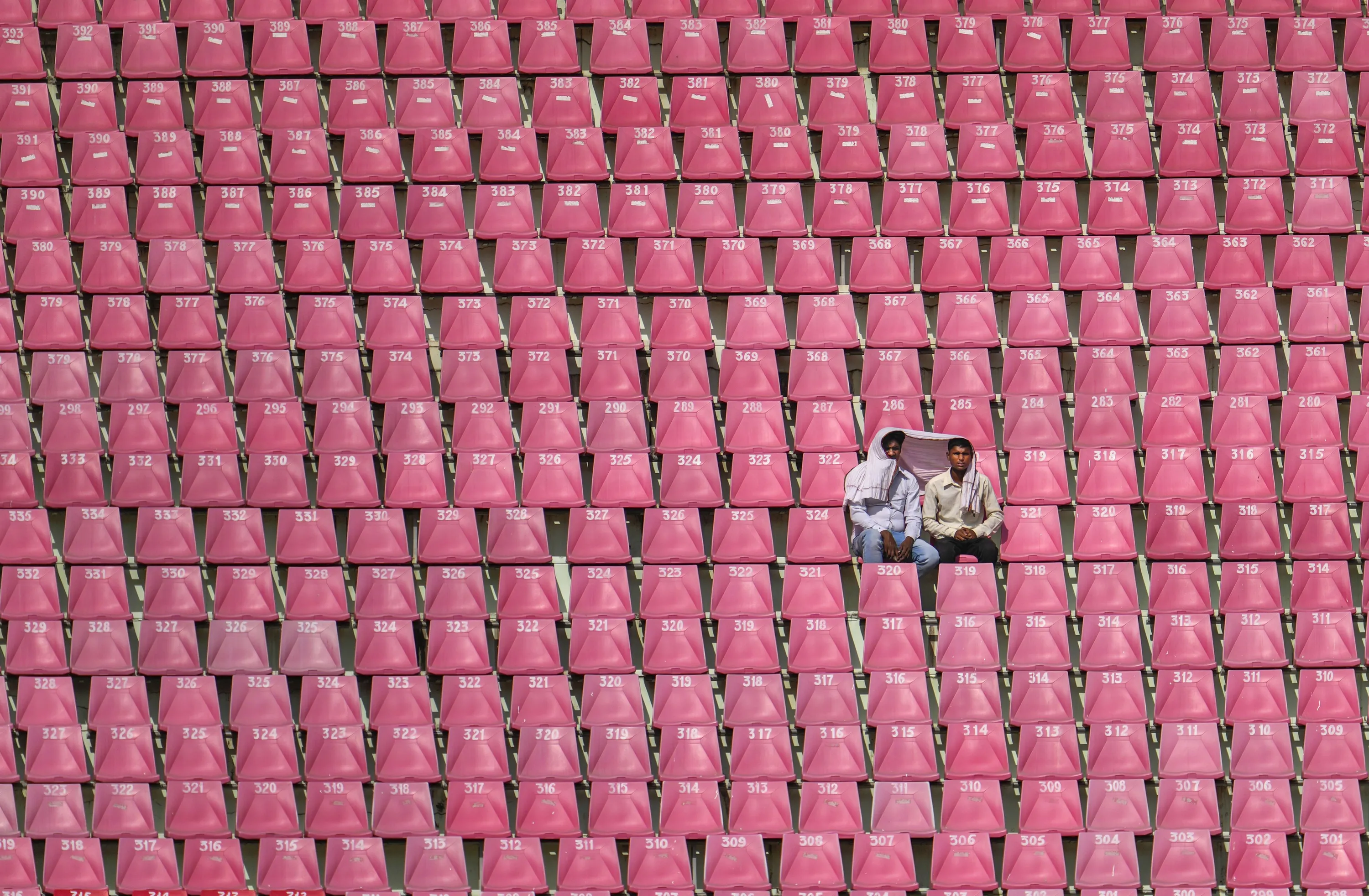 Two men share a piece of cloth to protect from the sun as they watch from a deserted gallery the ICC Cricket World Cup match between Australia and South Africa in Lucknow, India, Thursday, October 12, 2023. (Photo by Altaf Qadri/AP Photo)