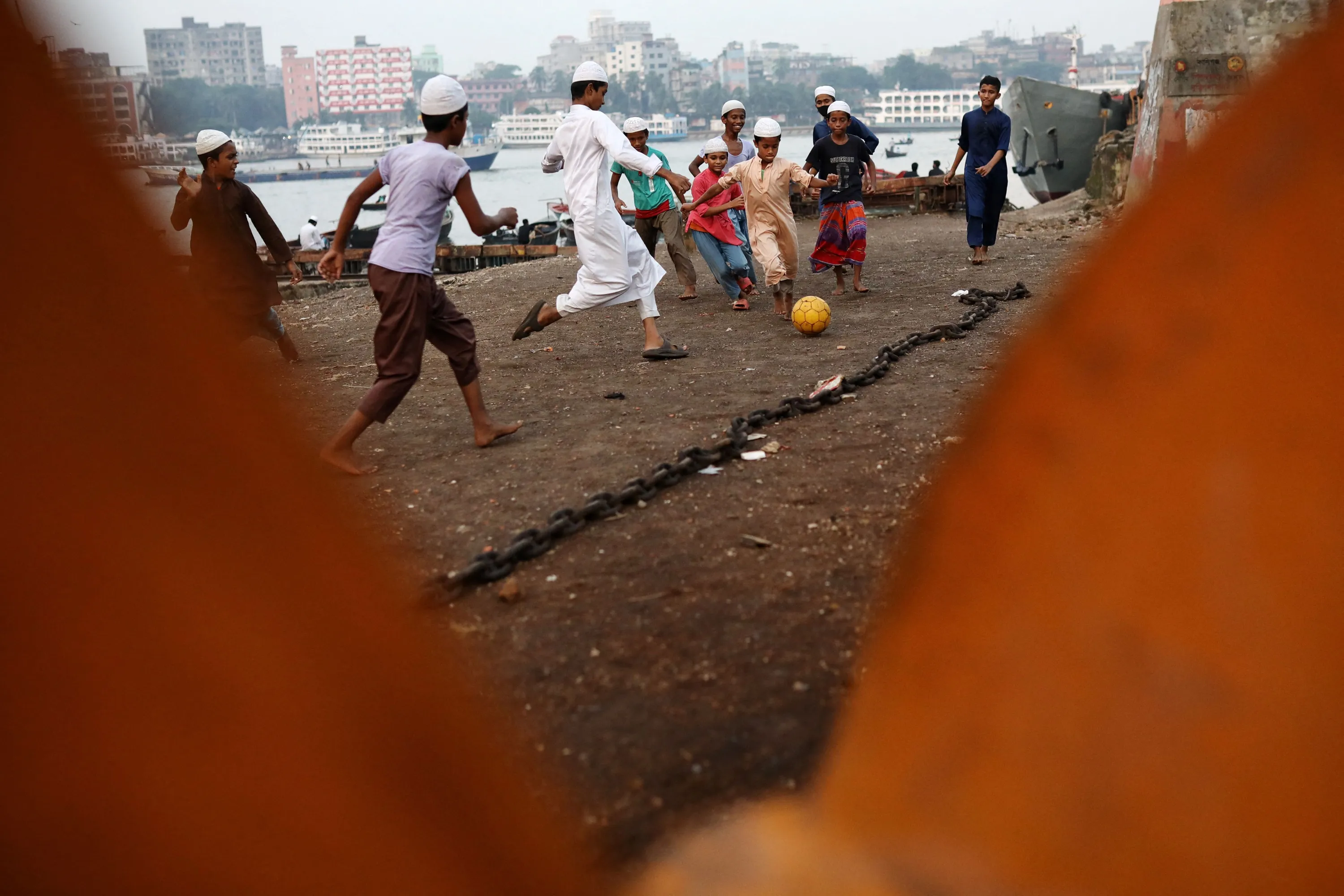 Children play football at dockyard premises in Dhaka, Bangladesh on October 9, 2023. (Photo by Mohammad Ponir Hossain/Reuters)