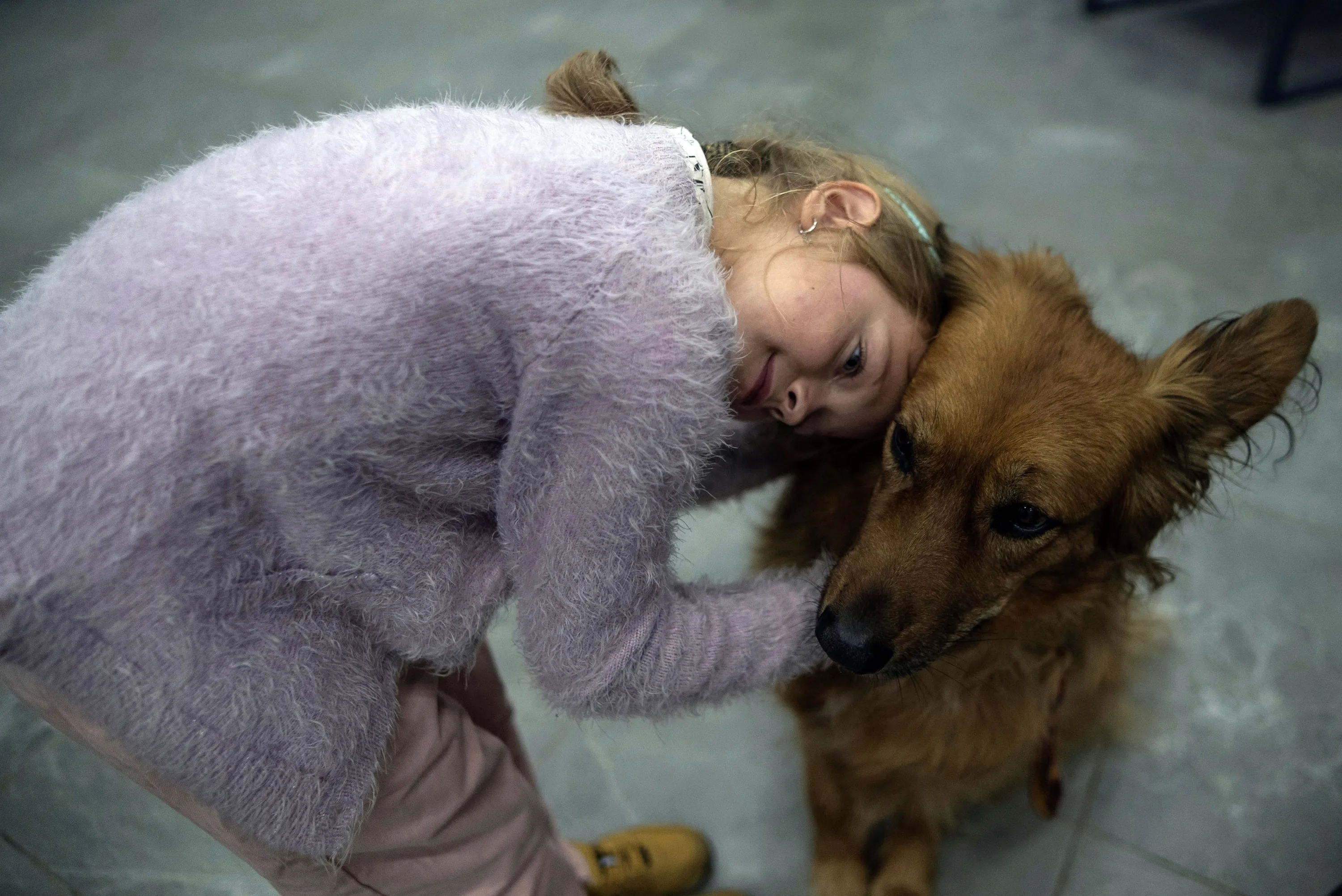 Varvara Zagumenna, 9, pets Chelsea, a specially trained canistherapy animal, in Vcentri Hub, Kyiv, Ukraine, Thursday, October 12, 2023. Canisterapy classes were organized by Base 4.5.0. and Innikos for children of fallen and serving Ukrainian servicemen. Canistherapy is a method of rehabilitation using the relationship between a person and a dog. (Photo by Alex Babenko/AP Photo)