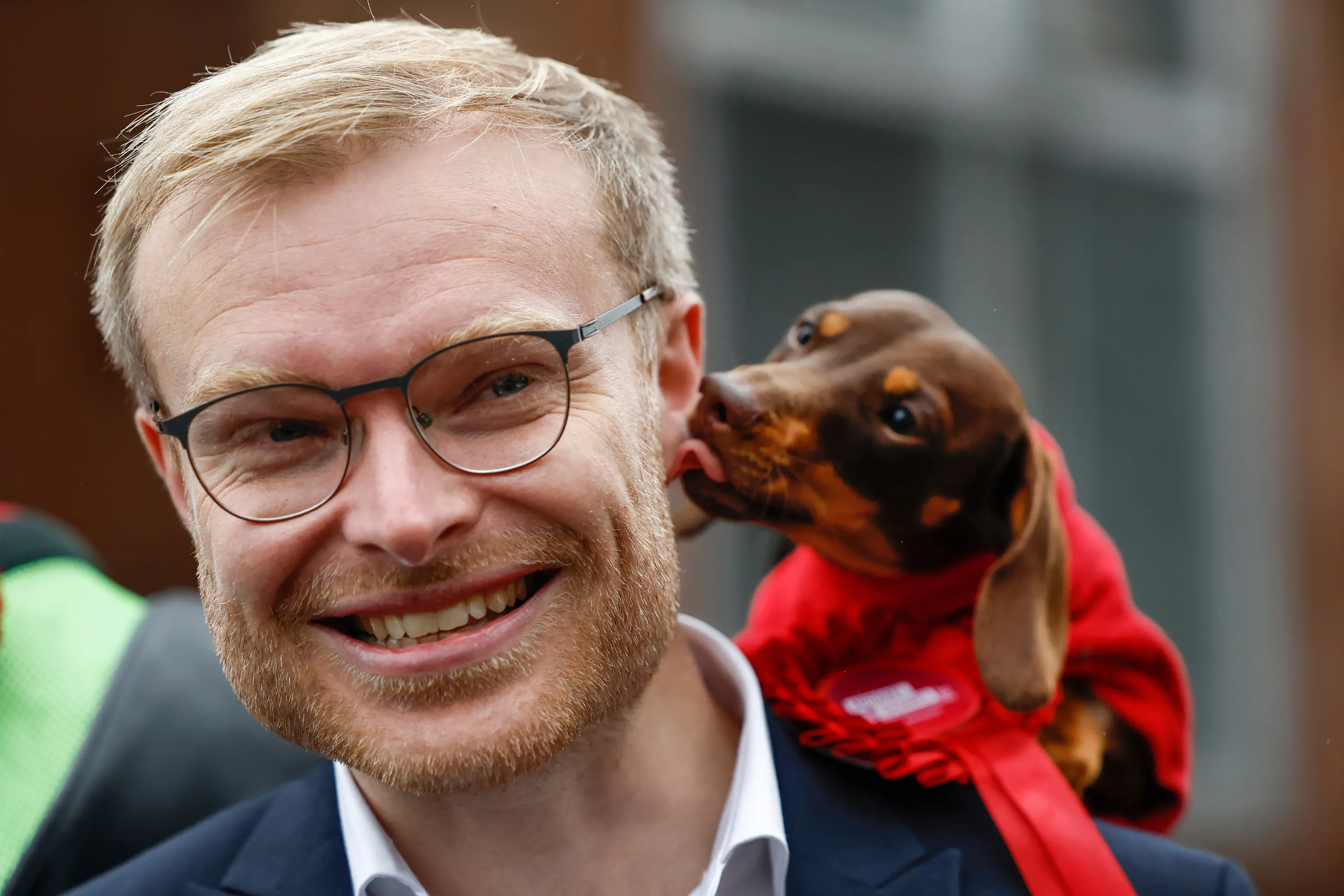 Dachshunds Allan and Stanley turn out for Scottish Labour candidate for Rutherglen and Hamilton West Michael Shanks as he attends a polling station to cast his vote on October 05, 2023 in Rutherglen, Scotland. The by-election in the Rutherglen and Hamilton West constituency was triggered after a successful petition to oust MP Margaret Ferrier in June 2023, following her breach of COVID-19 regulations in September 2020. (Photo by Jeff J. Mitchell/Getty Images)