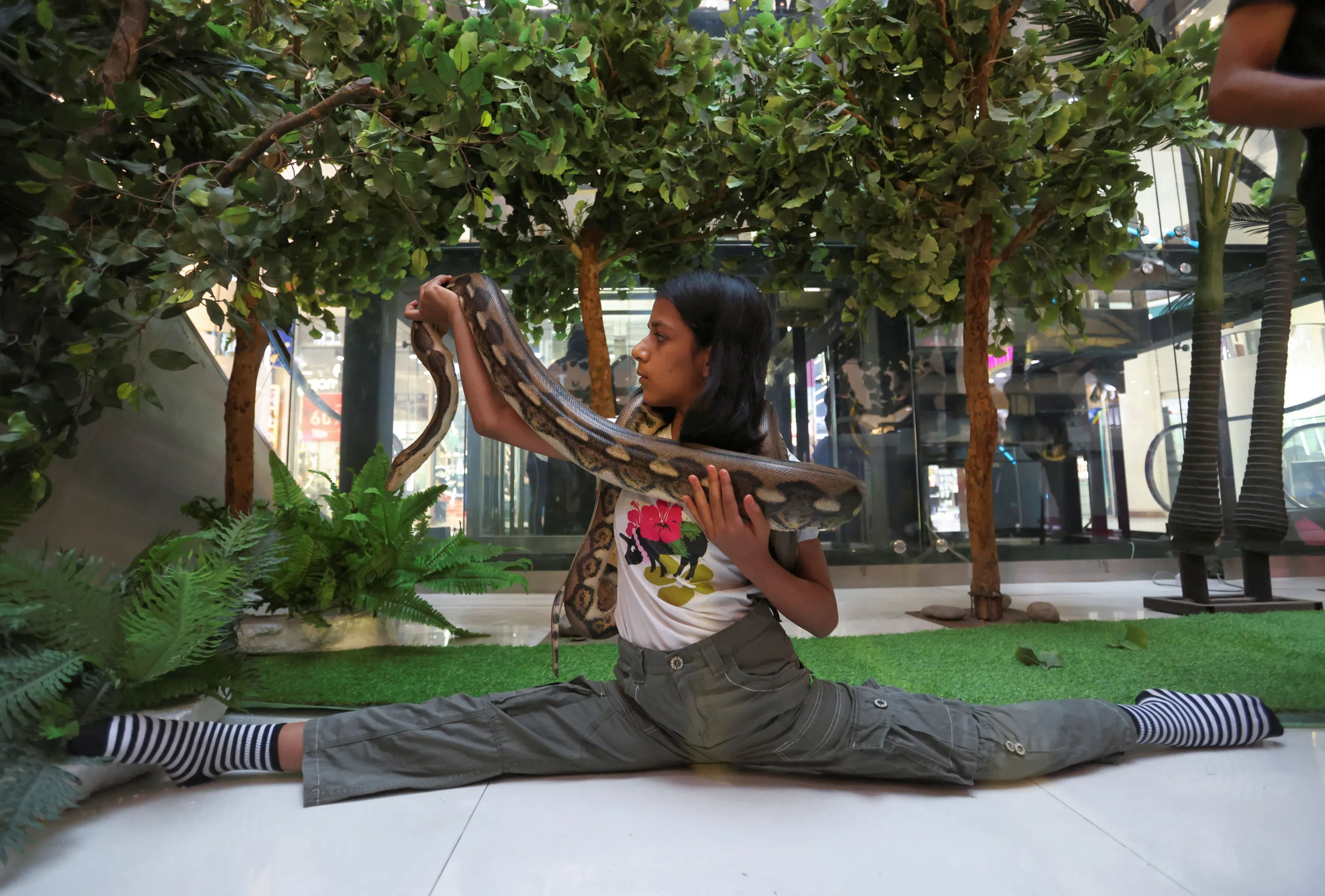 A girl holds a snake as breeders display reptiles, lizards and snakes during a Reptile and Snake festival at a shopping mall in Baghdad, Iraq on October 5, 2023. (Photo by Ahmed Saad/Reuters)
