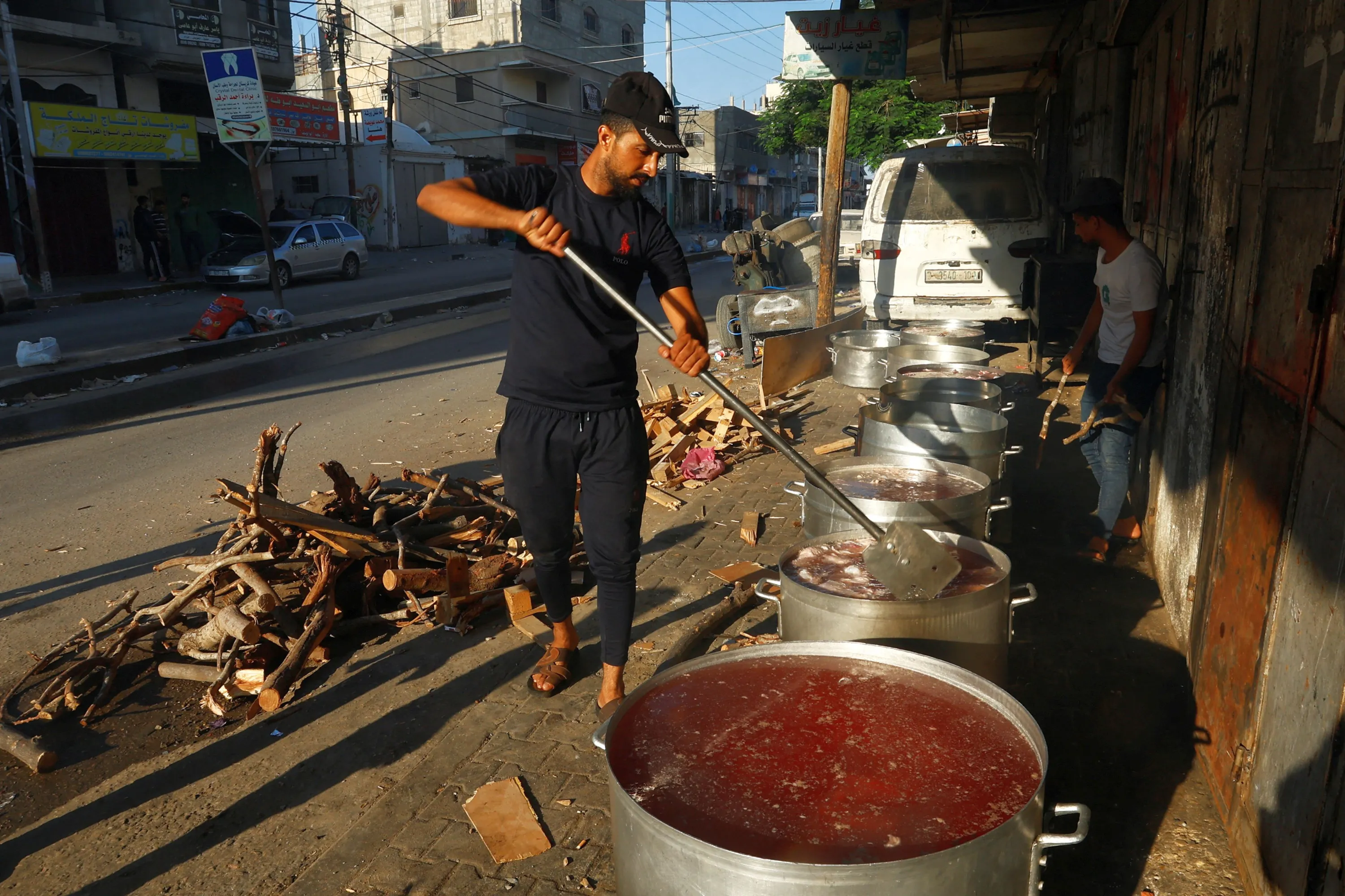 People cook on firewood amid shortages of fuel and gas to provide food for Palestinians who fled their houses amid Israeli strikes in Khan Younis, in the southern Gaza Strip on October 15, 2023. (Photo by Ibraheem Abu Mustafa/Reuters)