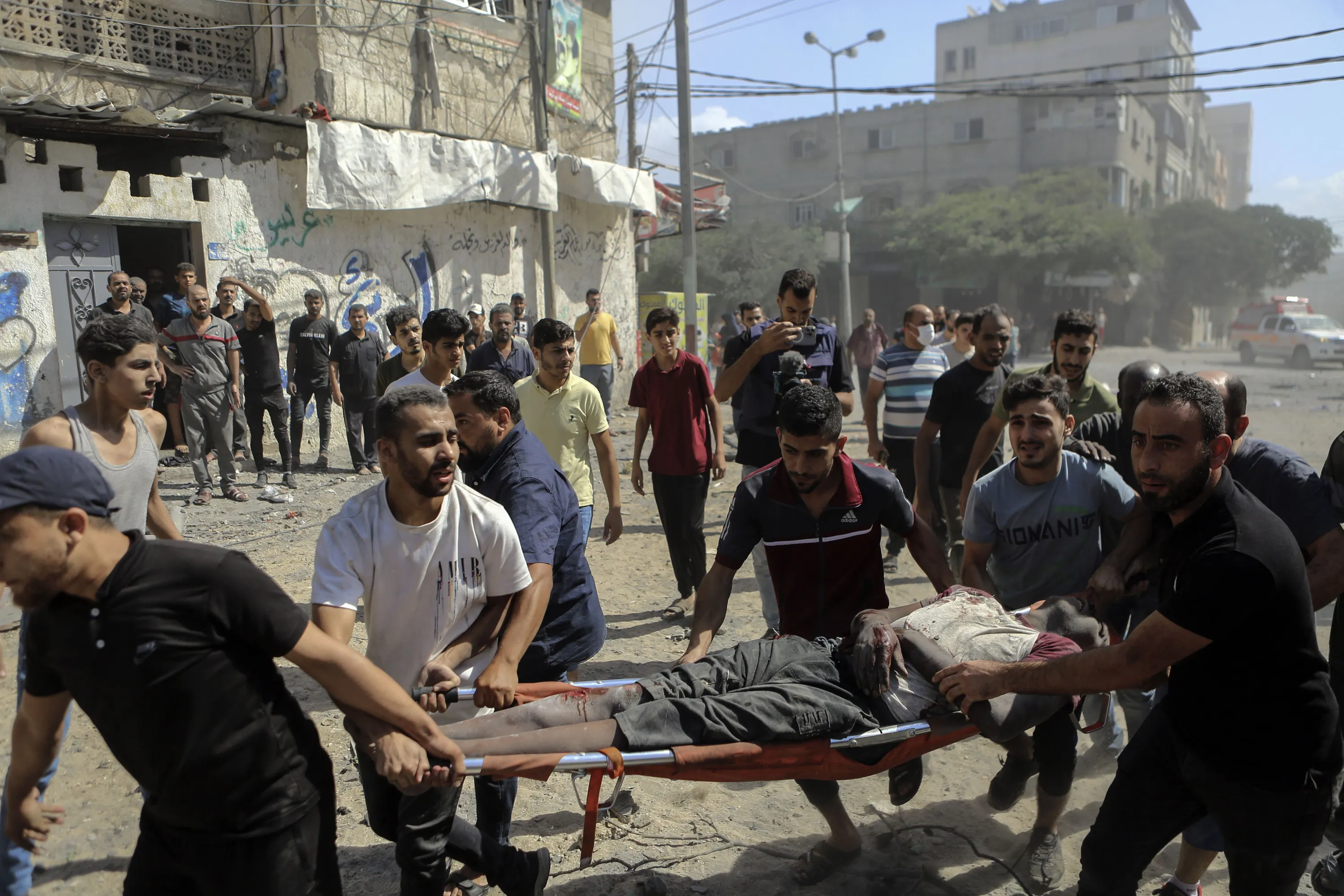 Palestinians carry the body of a man following Israeli airstrikes hitting buildings, in Gaza City central of the Gaza Strip, Sunday, October 15, 2023. (Photo by Abed Khaled/AP Photo)