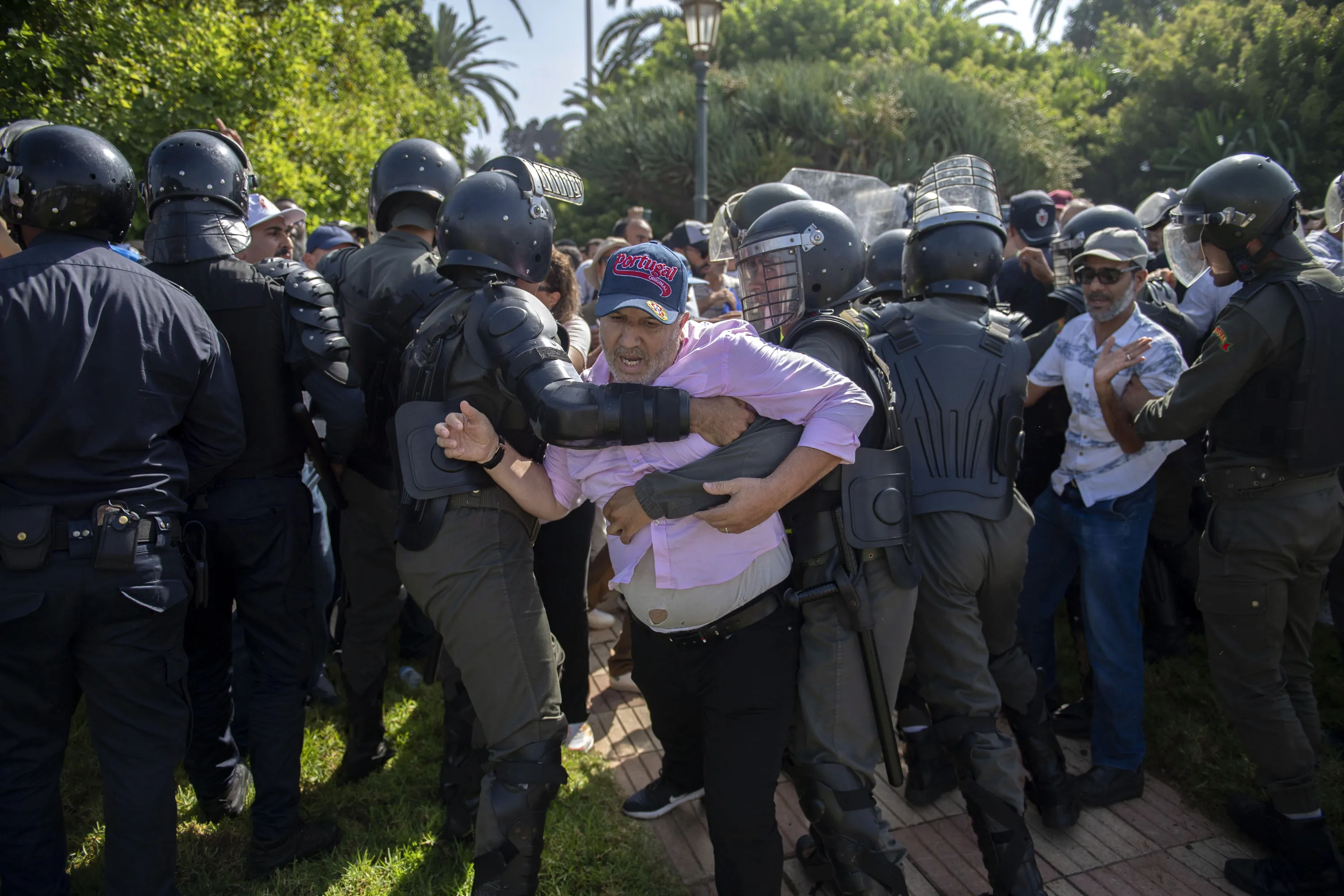 Educational workers clash with police as they protest over the statute for employees of the national education sector at the Ministry of Education headquarters in Rabat, Morocco, 05 Ocotber 2023, coinciding with the commemoration of World Teachers' Day, which falls on 05 October each year. (Photo by Jalal Morchidi/EPA)