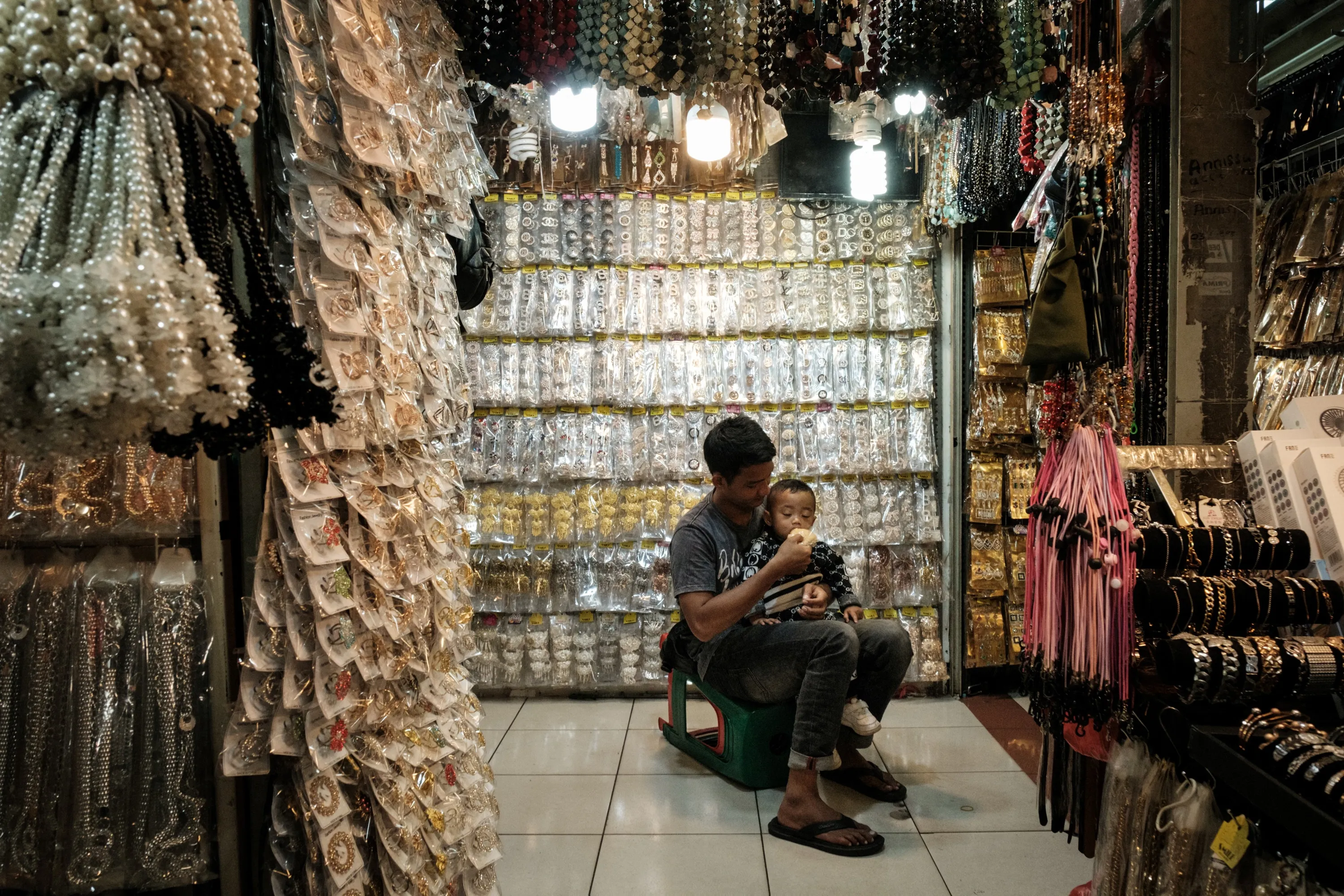 A man feeds his one-year-old son at Tanah Abang Market, Southeast Asia's largest wholesale shopping center for garment and textile, in Jakarta on September 28, 2023. (Photo by Yasuyoshi Chiba/AFP Photo)