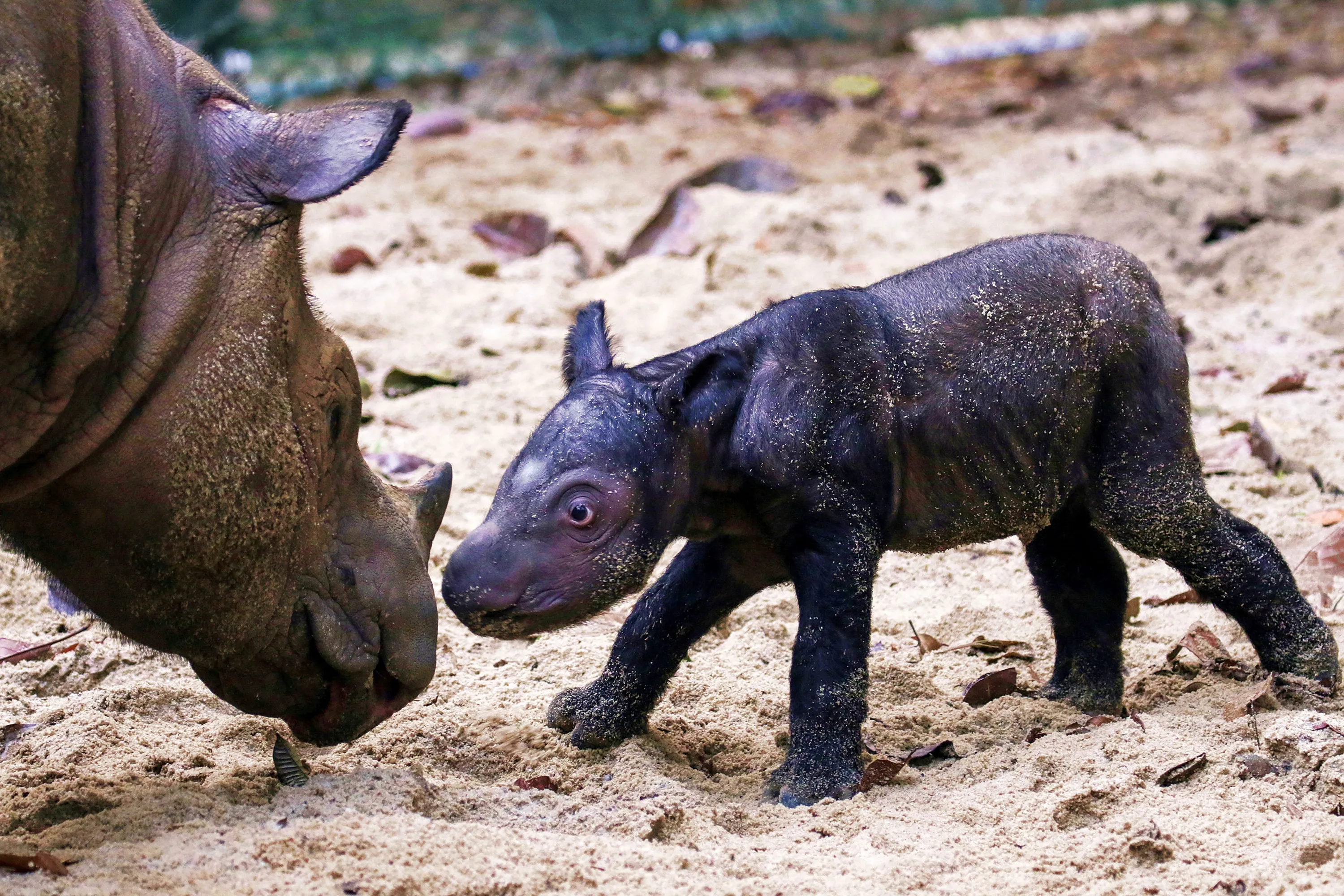 An endangered recently born female Sumatran rhinoceros is seen next to her mother, Ratu, at Sumatran Rhino Sanctuary of Kambas National Park, Lampung, Indonesia on September 30, 2023, in this photo taken by Antara Foto. (Photo by Antara Foto via Reuters)