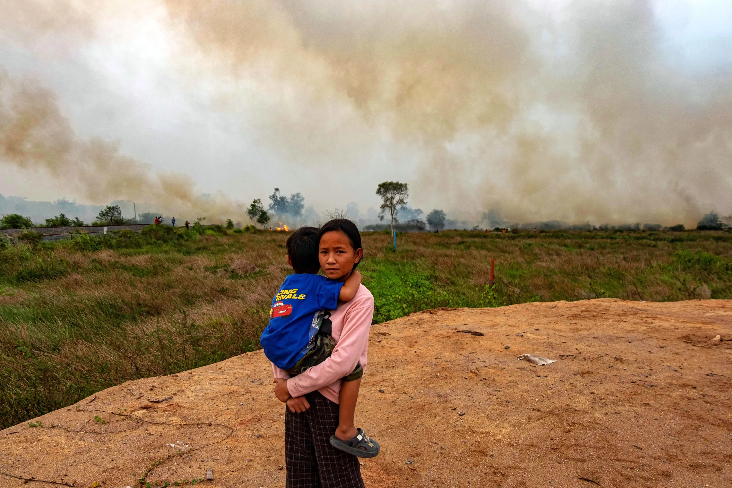 This picture taken on October 4, 2023, shows Poppy, 12, holding her brother as Indonesian firefighters try to extinguish a peatland fire near her house in Palembang, South Sumatra. (Photo by Al Zulkifli/AFP Photo)