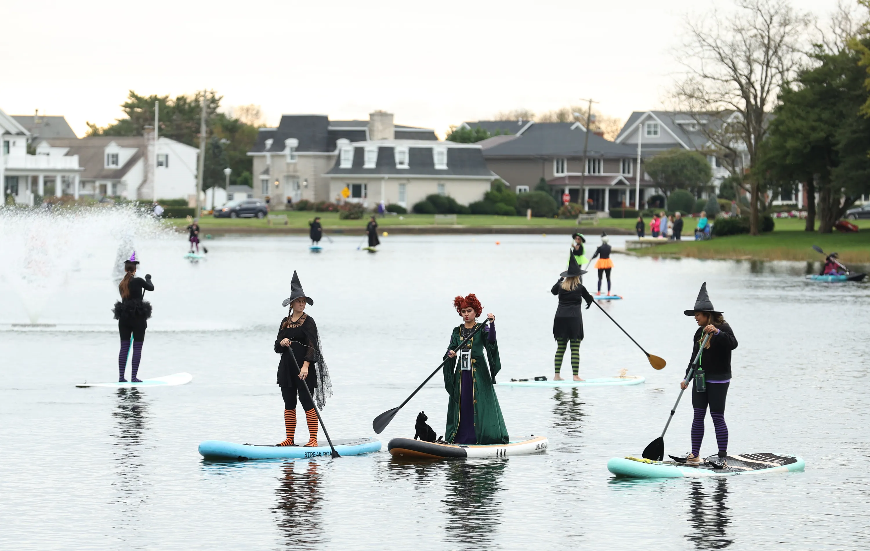 Dozens of people wearing witch costumes stand-up on paddle boards to take part in a Halloween float, in Spring Lake, New Jersey, United States on October 14, 2023. (Photo by Lokman Vural Elibol/Anadolu via Getty Images)