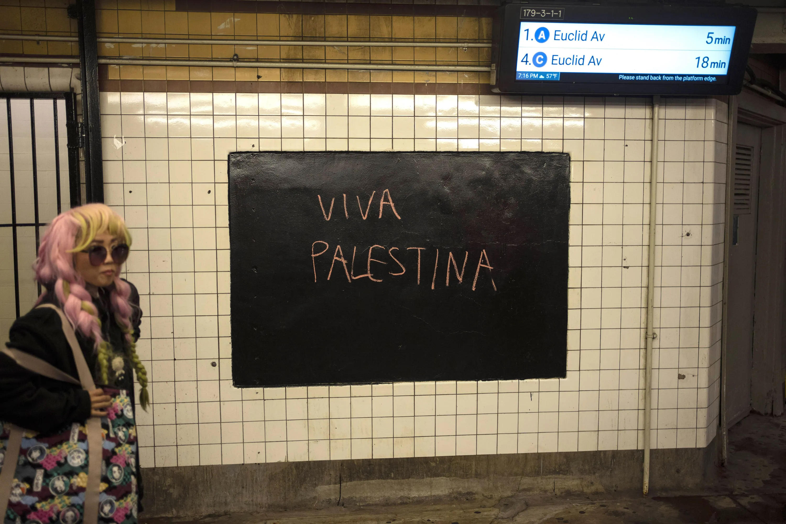 A woman walks next to graffiti reading in Spanish “Long Live Palestine”, in a subway station in the Brooklyn borough of New York, Sunday, October 15, 2023. (Photo by Rodrigo Abd/AP Photo)