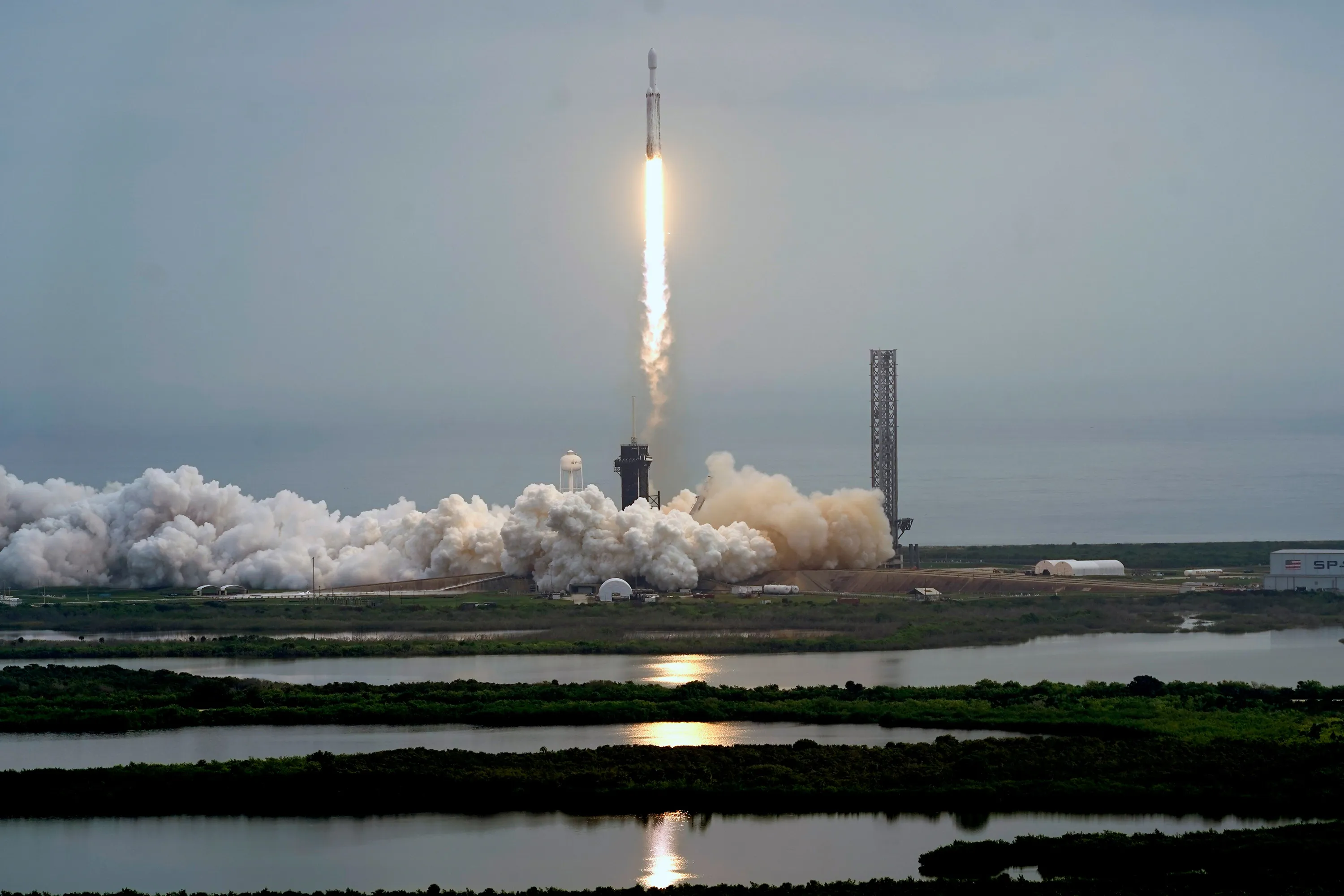 A SpaceX Falcon Heavy rocket lifts off from pad 39A at the Kennedy Space Center in Cape Canaveral, Fla., Friday, October 13, 2023. The spacecraft will travel to the metallic asteroid Psyche, where it will enter orbit in 2029 and be the first spacecraft to explore a metal-rich asteroid. (Photo by John Raoux/AP Photo)