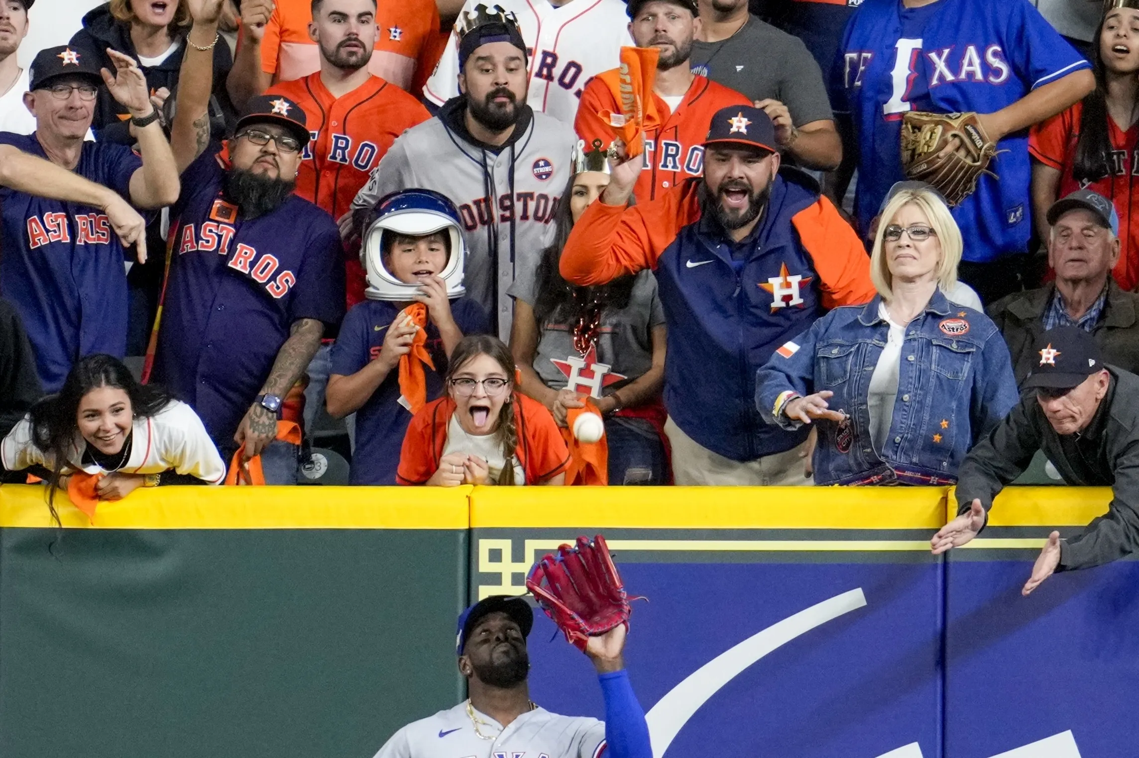 Fans try to distract Texas Rangers' Adolis Garcia as he catches a ball hit by Houston Astros' Jeremy Pena during the ninth inning of Game 2 of the baseball AL Championship Series Monday, October 16, 2023, in Houston. (Photo by Godofredo A. Vasquez/AP Photo)