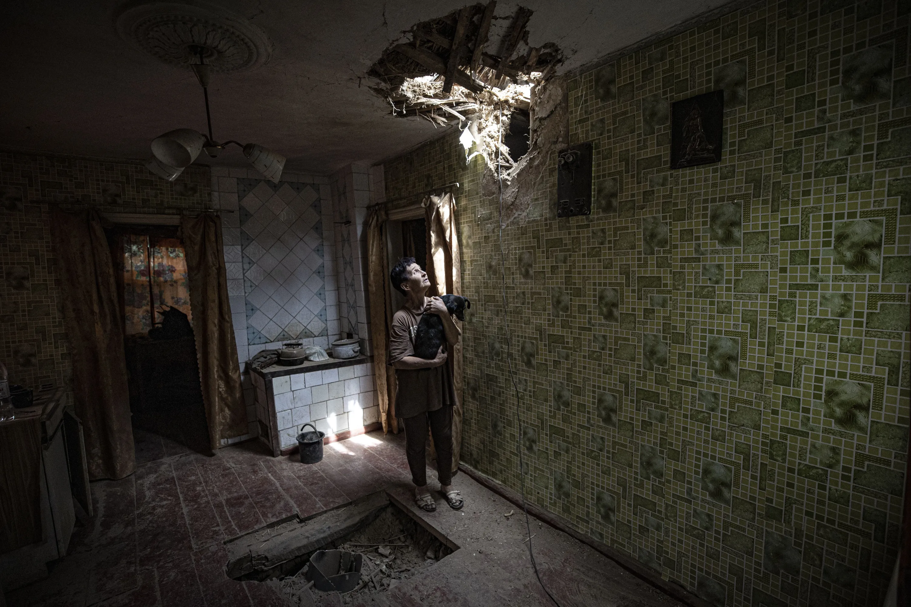 61-year-old Nina Ovcarovanina looks at the hole that made by rocket during the Russian missile attack as Russia-Ukraine War continues in Bakhmut, Donetsk Oblast, Ukraine on July 25, 2022. Russian air strikes on the cities of Bakhmut, Kramatorsk, Chasiv Yar, Slavyansk and Konstantinovka and the surrounding villages, close to the Donetsk front line, which is one of the hottest points of the Russia-Ukraine war, continue increasingly. (Photo by Metin Aktas/Anadolu Agency via Getty Images)