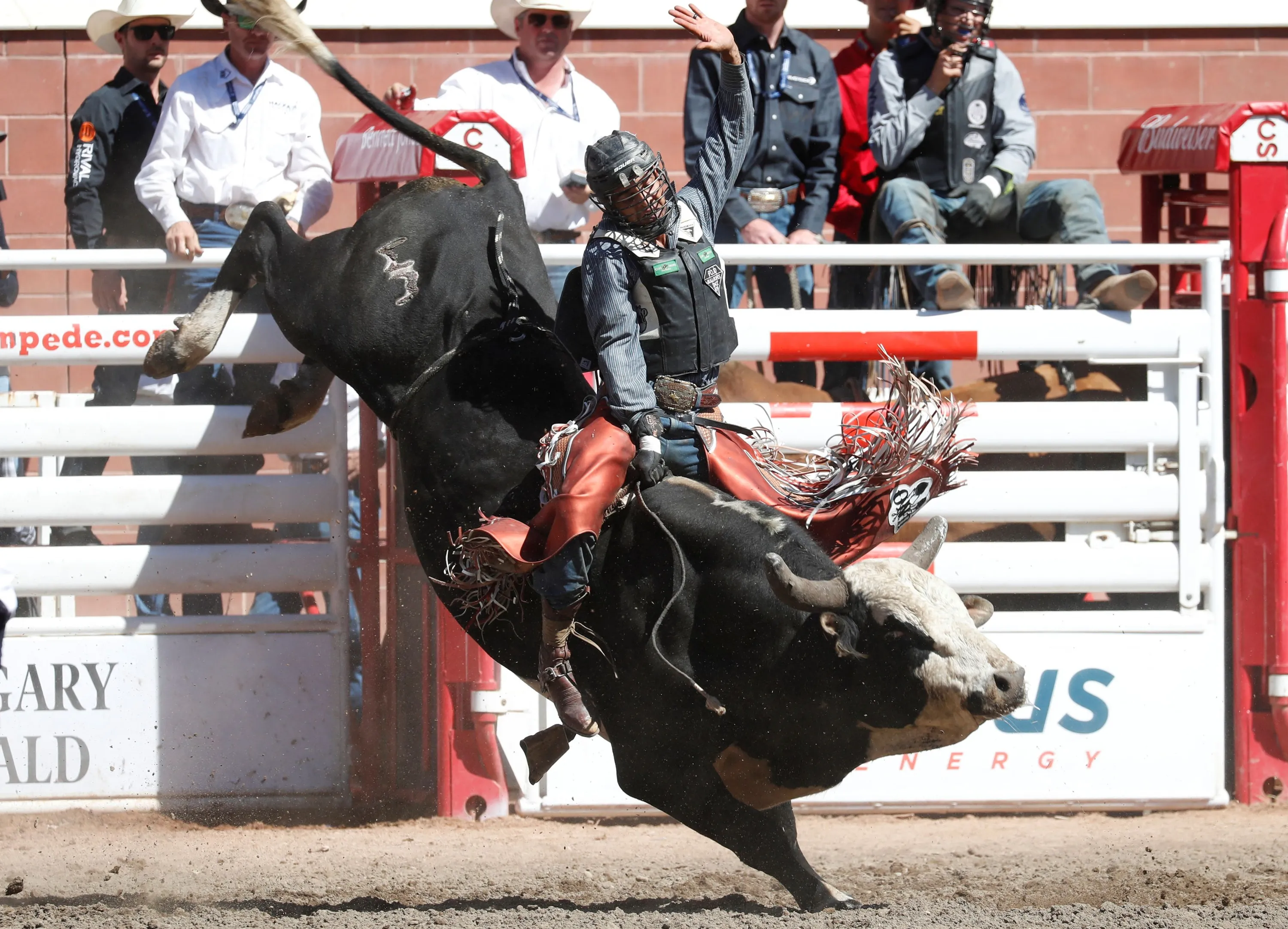 Reid Oftedahl of Raymond, Minnesota rides the bull Blitz Kraig in the bull riding event during the Calgary Stampede rodeo in Calgary, Alberta, Canada on July 11, 2022. (Photo by Todd Korol/Reuters)