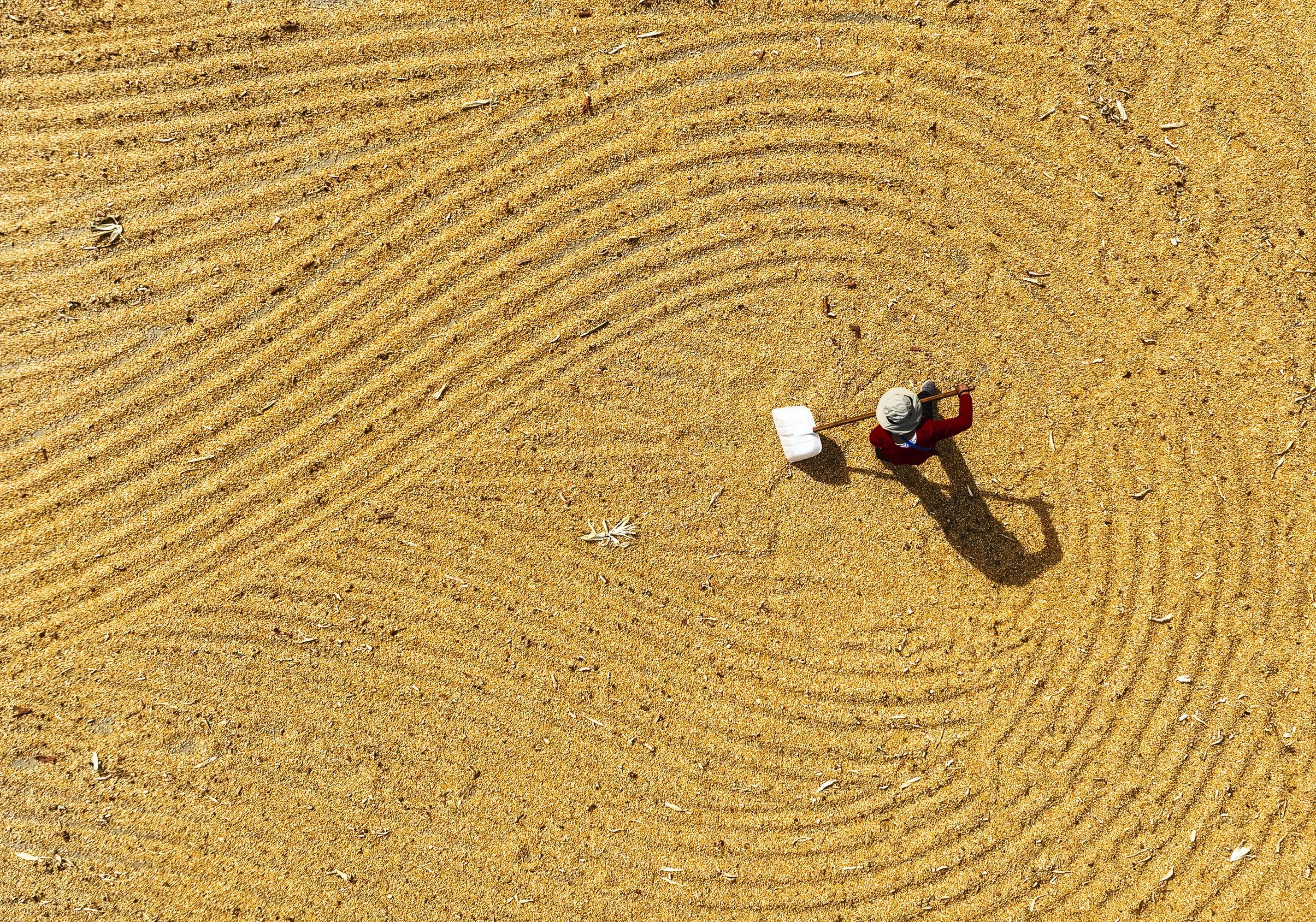 Aerial view of a farmer drying corns on October 10, 2023 in Zaozhuang, Shandong Province of China. (Photo by Hong Xiaodong/VCG via Getty Images)