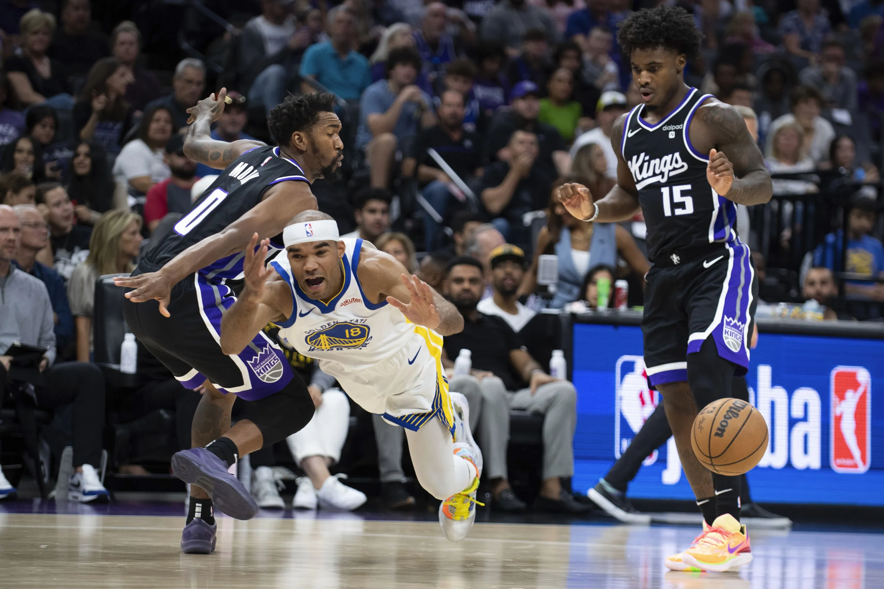 Sacramento Kings guard Davion Mitchell (15) watches as Golden State Warriors guard Jerome Robinson (18) is fouled by Kings guard Malik Monk (0) as he drives to the basket in the first quarter in an NBA preseason basketball game in Sacramento, Calif., Sunday, October 4, 2023. (Photo by José Luis Villegas/AP Photo)