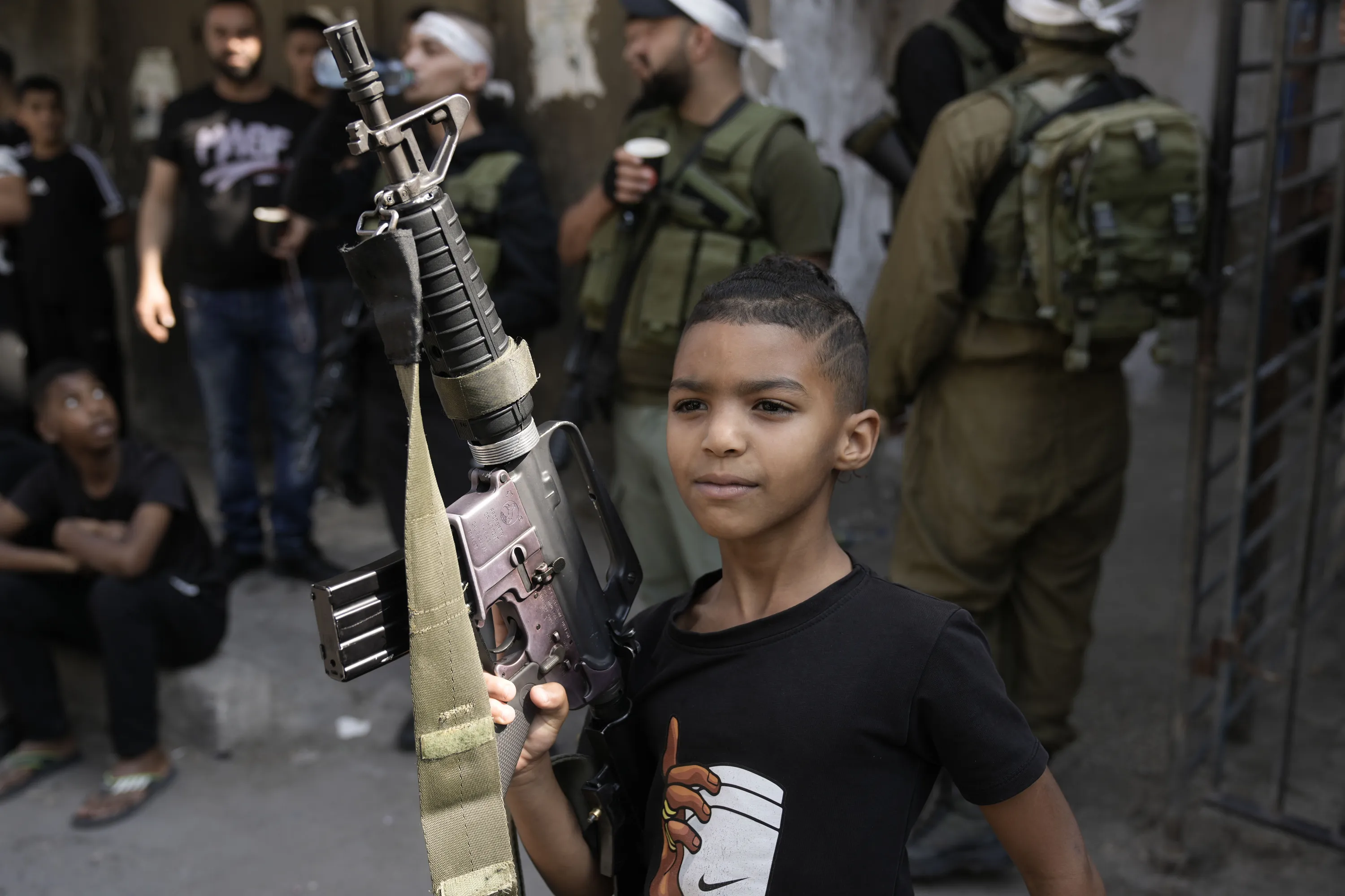 A Palestinian kid poses with an M-16 rifle during the funeral of Qasim Qasim, 23, in the West Bank city of Tulkarem, Saturday, October 14, 2023. Qasim was killed in clashes with Israeli forces on Friday following a demonstration supporting the Gaza Strip. (Photo by Majdi Muhammad/AP Photo)