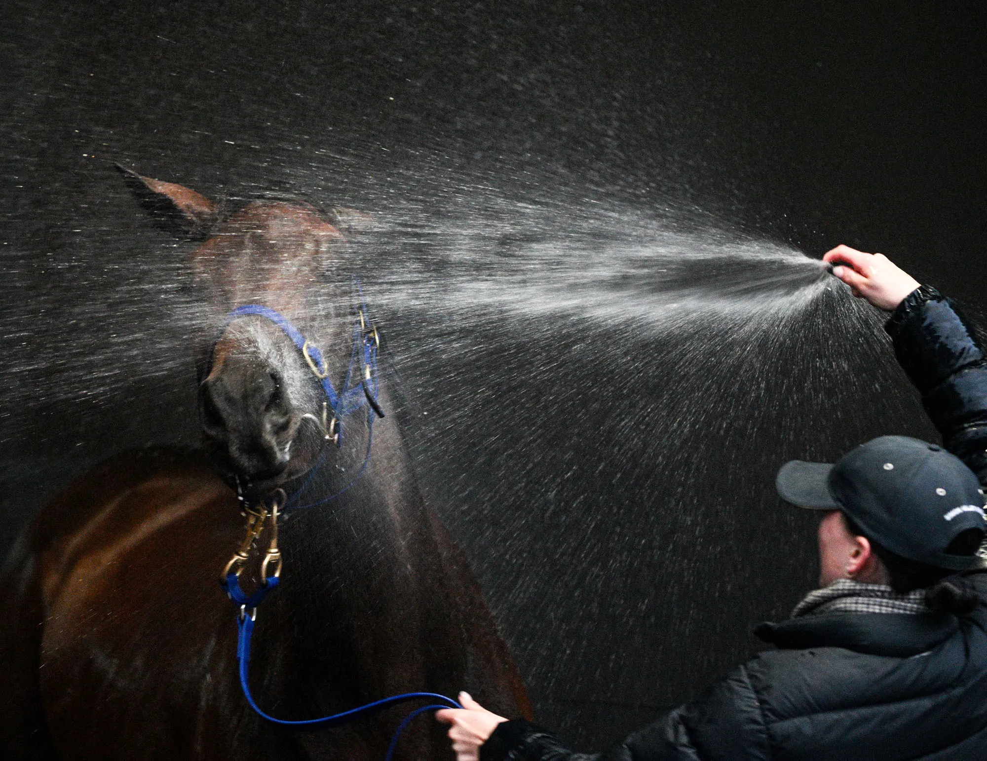 Siobhan O'Donnell washes Amelia's Jewel after a trackwork session at Caulfield Racecourse on October 10, 2023 in Melbourne, Australia. (Photo by Vince Caligiuri/Getty Images)