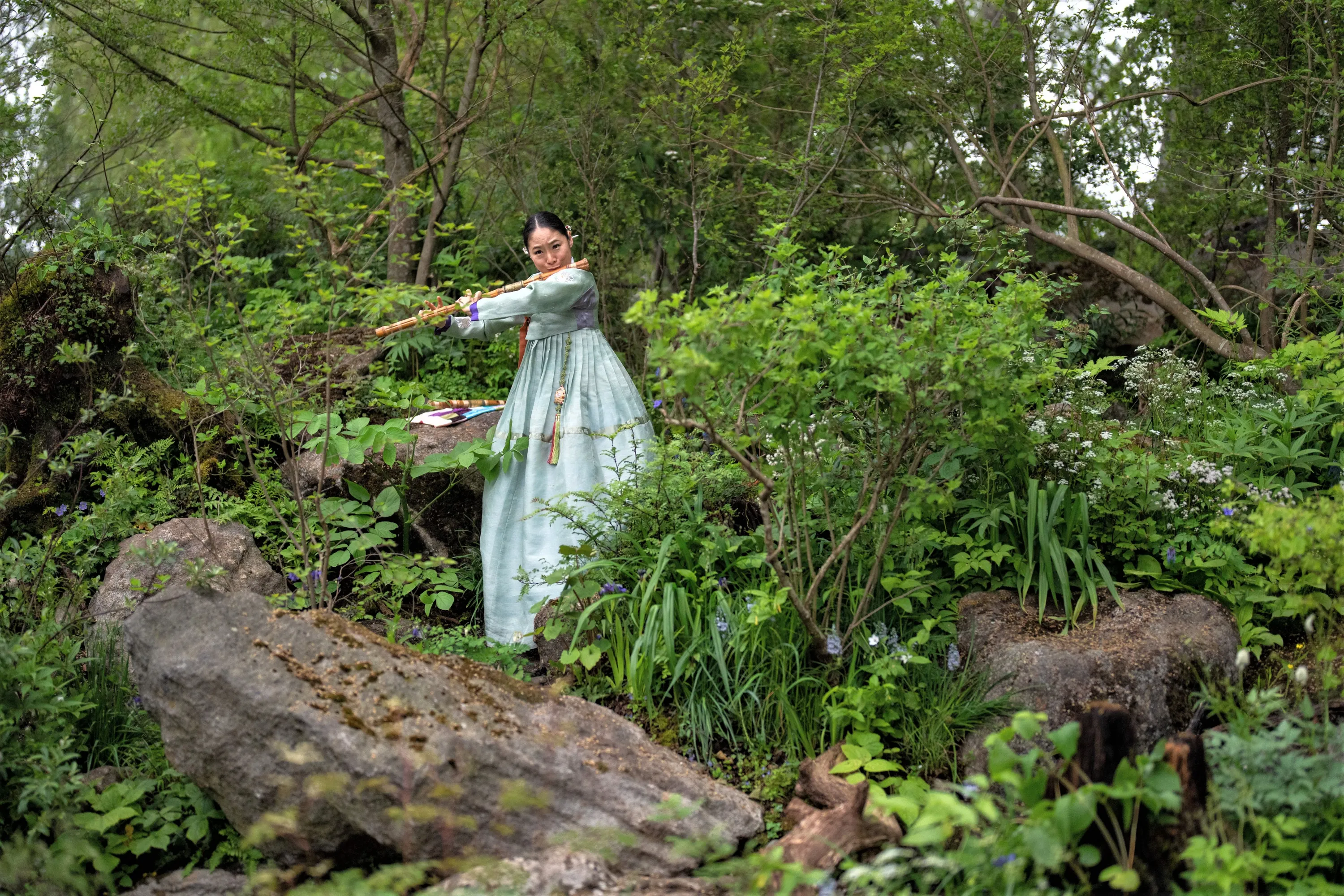 A Korean flautist performs in the “A Letter from a Million Years Past” Korean garden at the Chelsea Flower Show on May 22, 2023 in London, England. The Chelsea Flower Show, also known as the Great Spring Show, is held for five days in May by the Royal Horticultural Society on the grounds of the Royal Hospital Chelsea. (Photo by Carl Court/Getty Images)