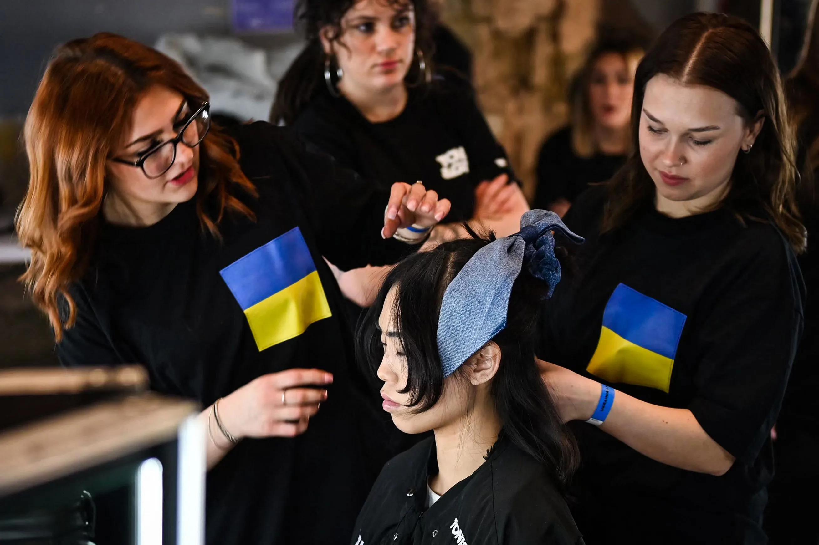 A model gets ready ahead of the Autumn/Winter 2023 Ukrainian fashion show collection on the fifth day of the London Fashion Week, in London, on February 21, 2023. (Photo by Justin Tallis/AFP Photo)