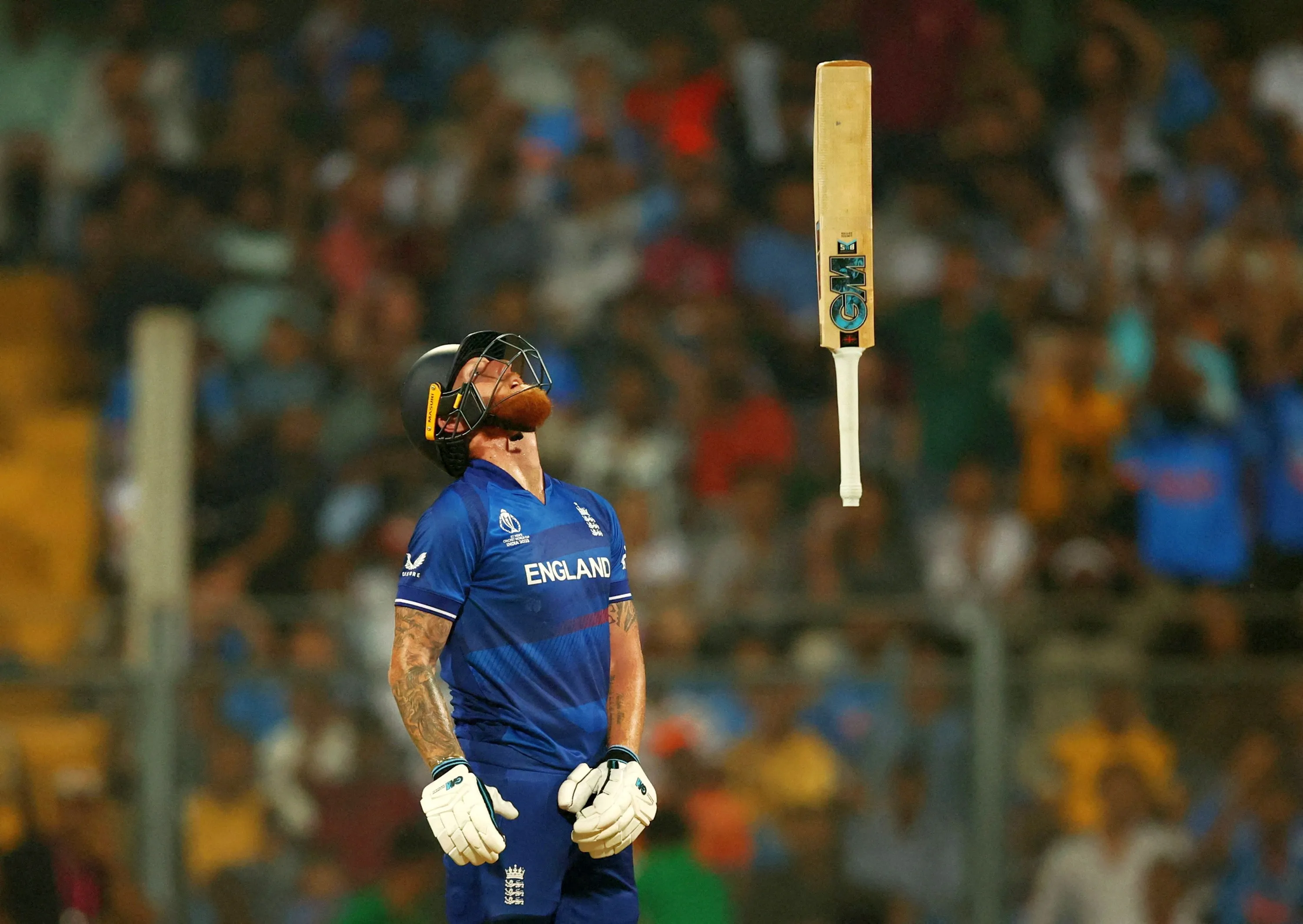 England's Ben Stokes loses his wicket at the ICC Cricket World Cup 2023 match against South Africa at Wankhede Stadium, in Mumbai, India on October 21, 2023. (Photo by Andrew Boyers/Reuters)