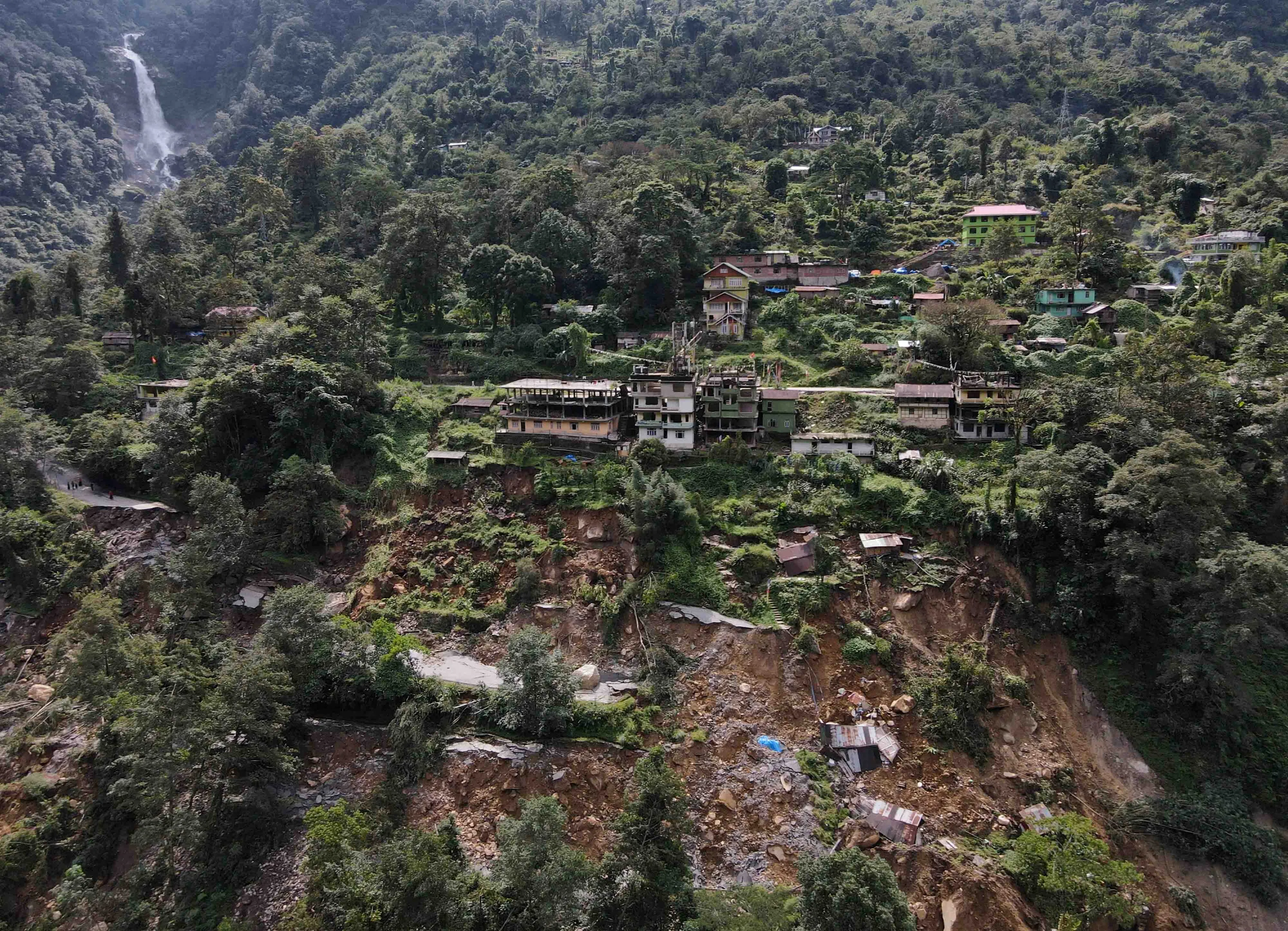 A drone view of damaged roads and houses that were washed away by flash floods in Naga-Namgor village, Sikkim, India on October 10, 2023. (Photo by Francis Mascarenhas/Reuters)
