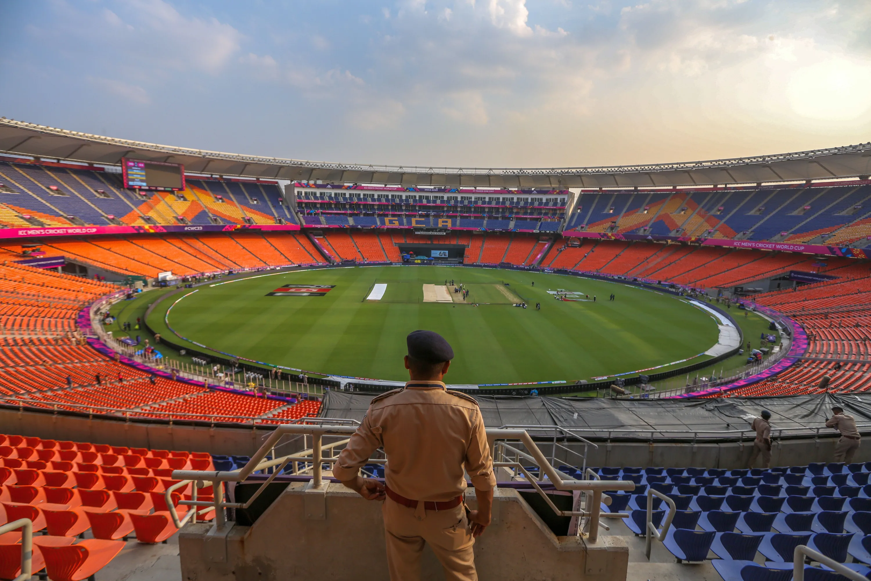 Indian security personnel stand guard at Narendra Modi Stadium in Ahmedabad, India, 13 October 2023. India will play against Pakistan on 14 October in a ICC Men's Cricket World Cup match at Narendra Modi Stadium. (Photo by Divyakant Solanki/EPA)