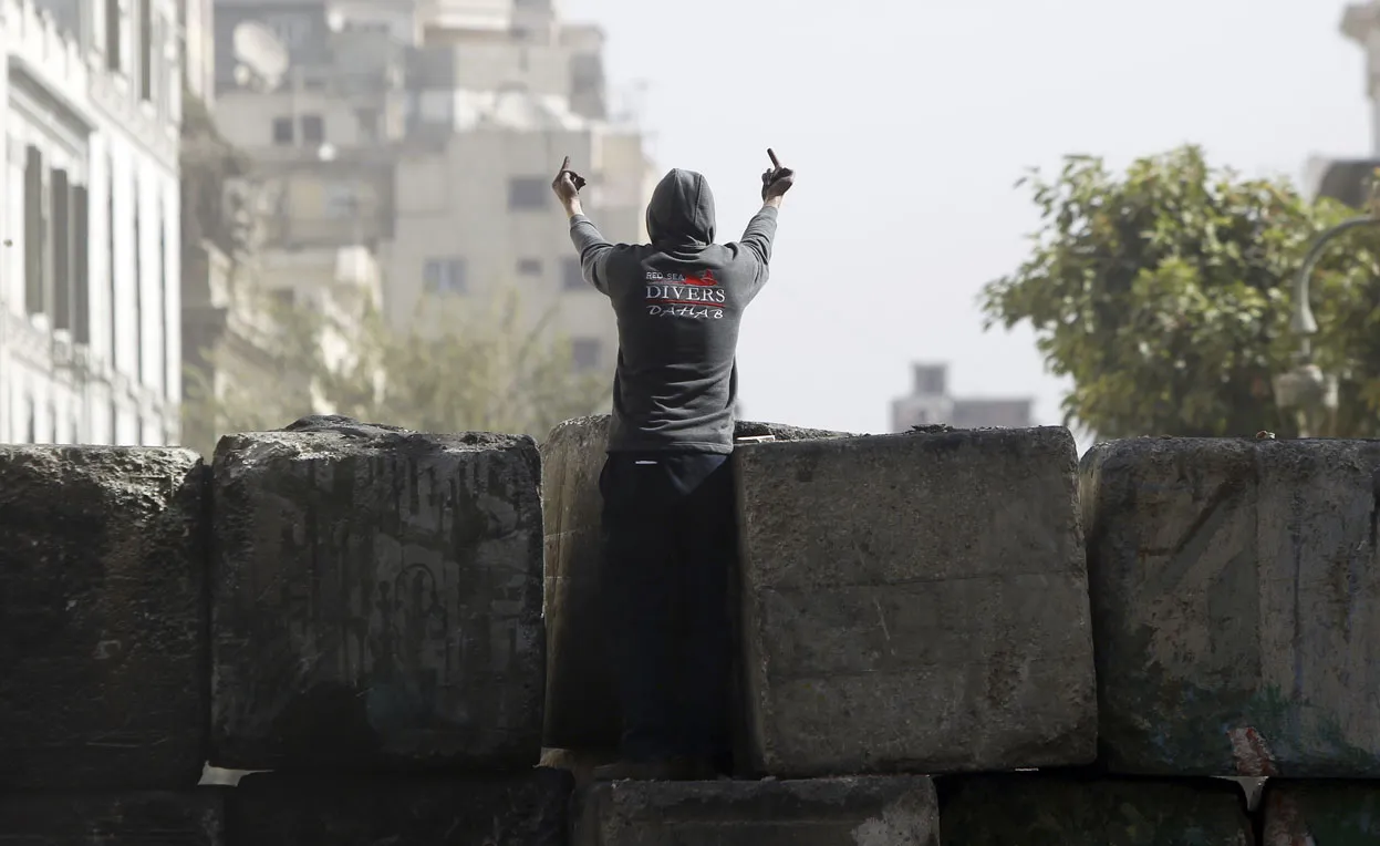 A protester on the wall towards riot police along Sheikh Rihan street near Tahrir Square in Cairo, on January 25, 2013. Opponents of Morsi and his Muslim Brotherhood allies massed in Cairo's Tahrir Square to revive the demands of a revolution they say has been betrayed by Islamists. (Photo by Amr Abdallah Dalsh/Reuters via The Atlantic)