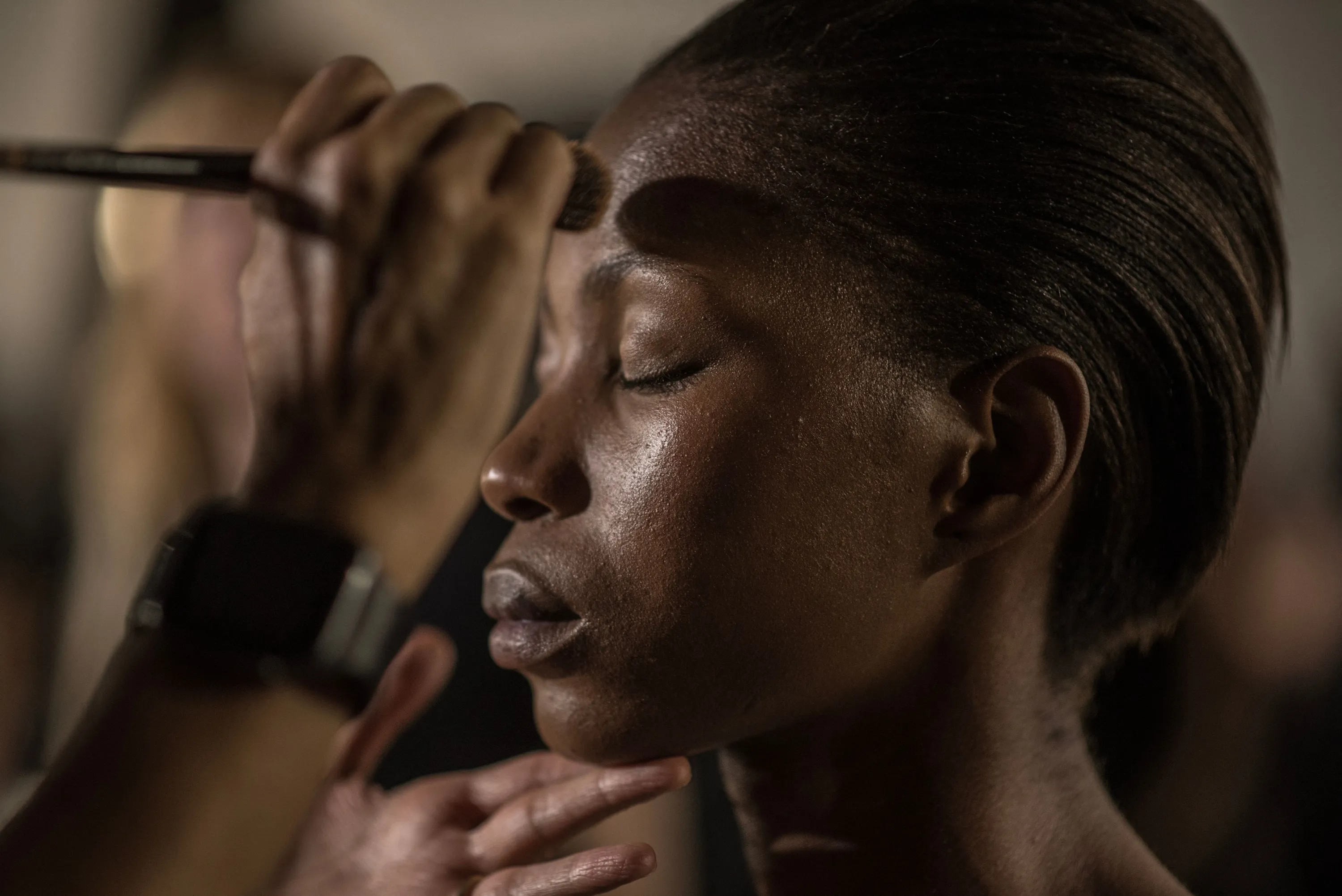 A model has make up done while backstage at the 2023 edition of the South African Fashion Week in Johannesburg, on October 19, 2023. (Photo by Luca Sola/AFP Photo)