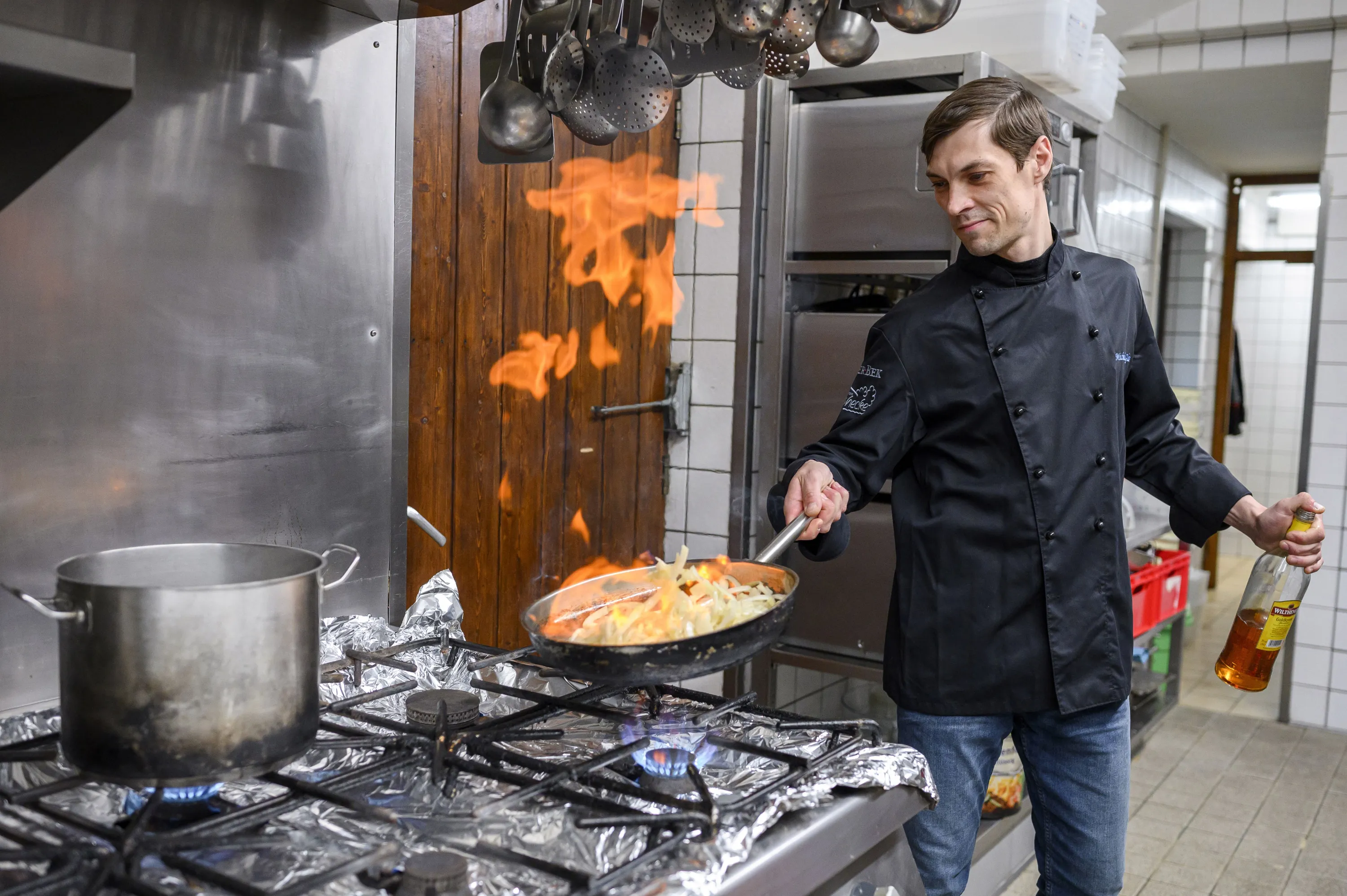 Vitaly from Kiev helps in the kitchen with the Glas family in Dippertz, Germany, Tuesday, April 5, 2022. He arrived in Germany on March 17, together with his family, after fleeing from Kiev. A report says Poland is losing large numbers of Ukrainian refugees from its workforce as they travel to Germany to seek higher wages and government benefits in the rich Western economy. Although the refugees are not economic migrants, they are increasingly taking on work as the war in Ukraine drags on for more than a year and a half. (Photo by Daniel Vogl/dpa via AP Photo)
