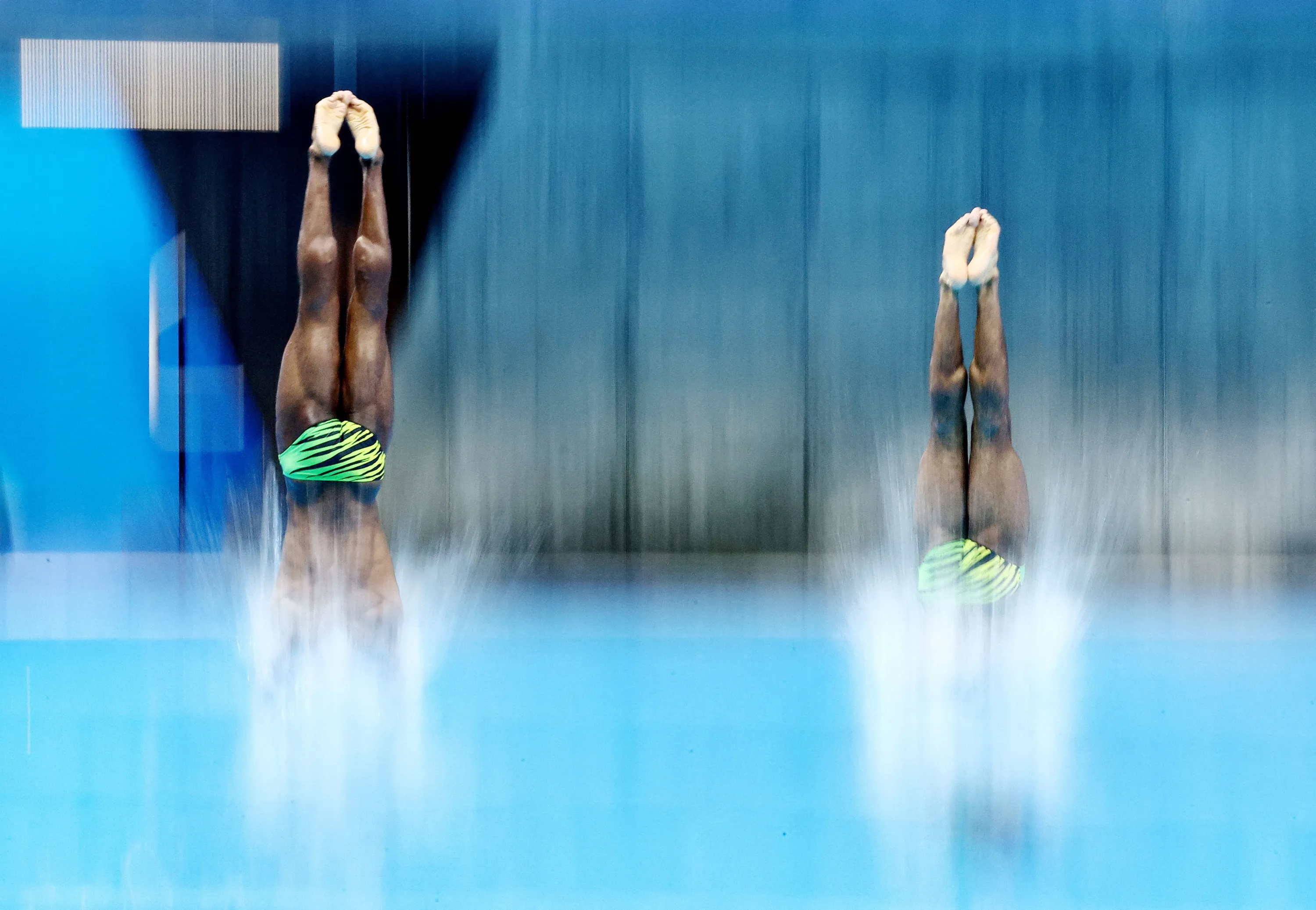 Jamaica's Yohan Eskrick-Parkinson and Yona Knight-Wisdom in action during the Men's Springboard Synchronized Final at the Pan Am Games in Santiago, Chile on October 24, 2023. (Photo by Luisa Gonzalez/Reuters)