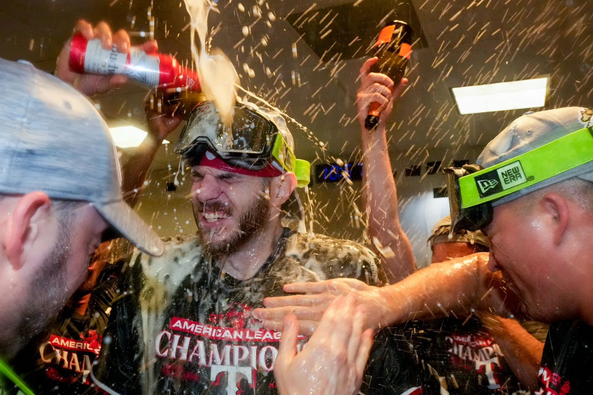 The Texas Rangers celebrate after Game 7 of the baseball AL Championship Series against the Houston Astros Monday, October 23, 2023, in Houston. The Rangers won 11-4 to win the series 4-3. (Photo by Godofredo A. Vásquez/AP Photo)