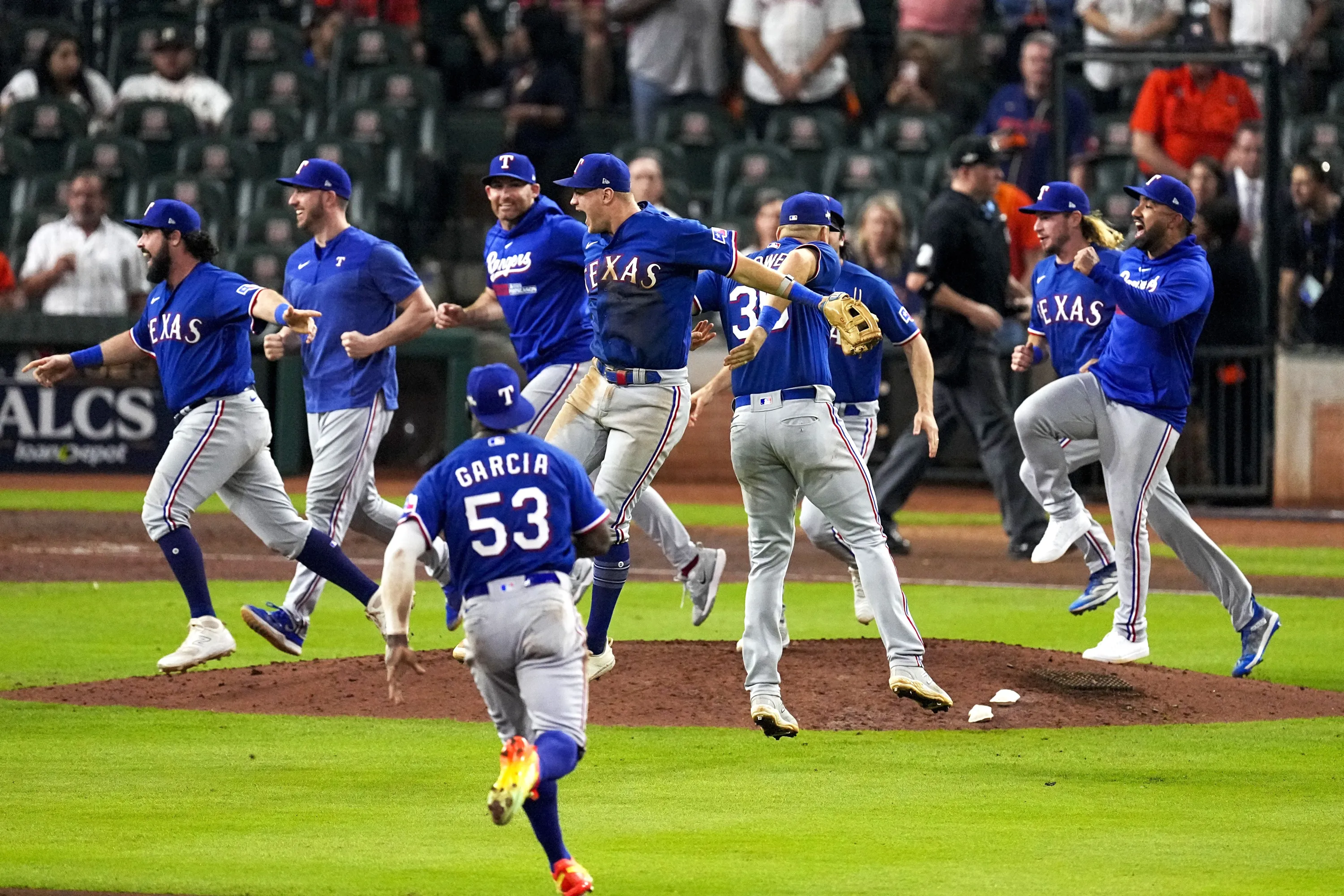 The Texas Rangers celebrate after Game 7 of the baseball AL Championship Series against the Houston Astros Monday, October 23, 2023, in Houston. The Rangers won 11-4 to win the series 4-3. (Photo by Tony Gutierrez/AP Photo)