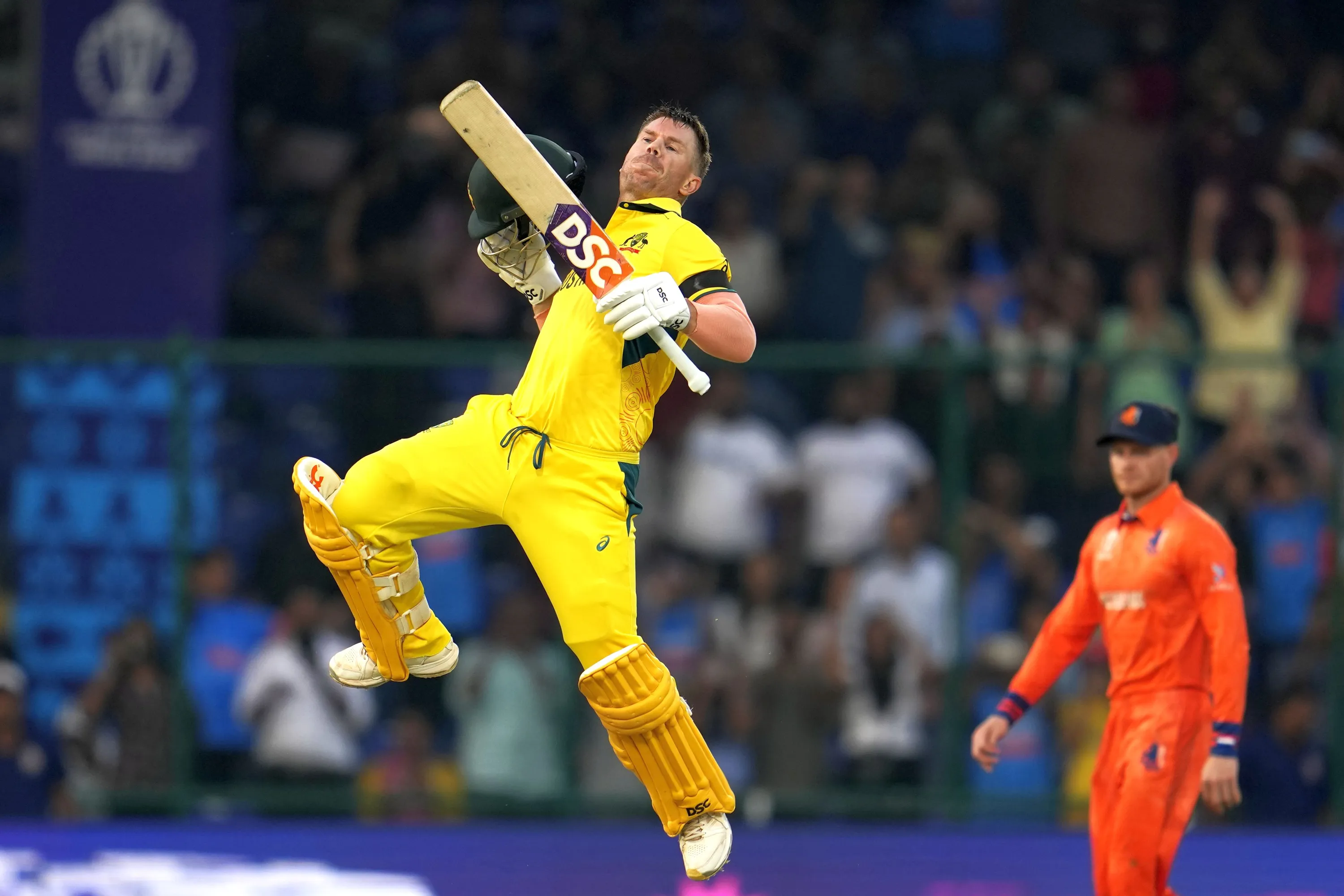 Australia's David Warner leaps to celebrate scoring a century during the ICC Men's Cricket World Cup match between Australia and Netherlands in New Delhi, India, Wednesday, October 25, 2023. (Photo by Manish Swarup/AP Photo)