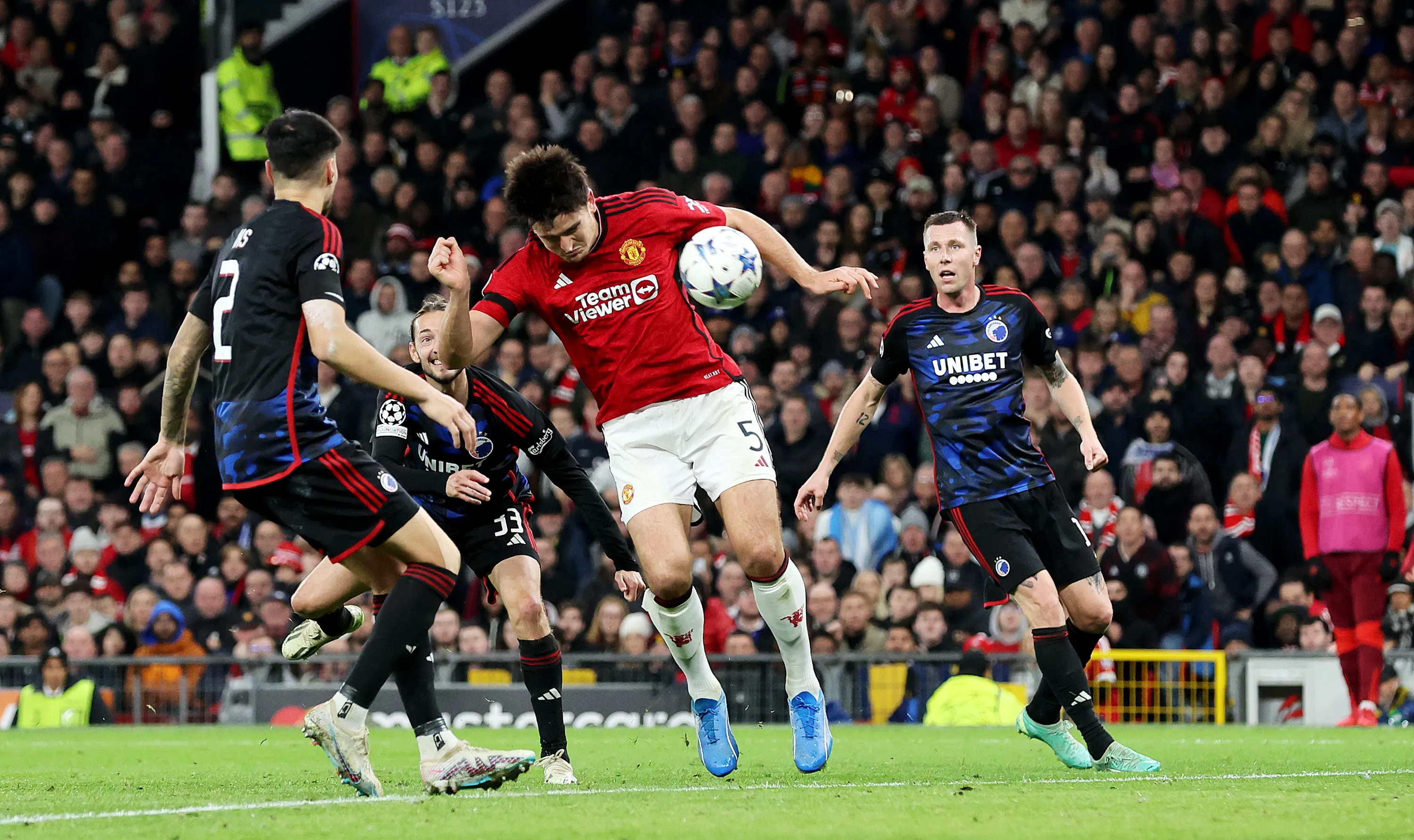 Harry Maguire of Manchester United scores the team's first goal during the UEFA Champions League match between Manchester United and F.C. Copenhagen at Old Trafford on October 24, 2023 in Manchester, England. (Photo by Jan Kruger/Getty Images)