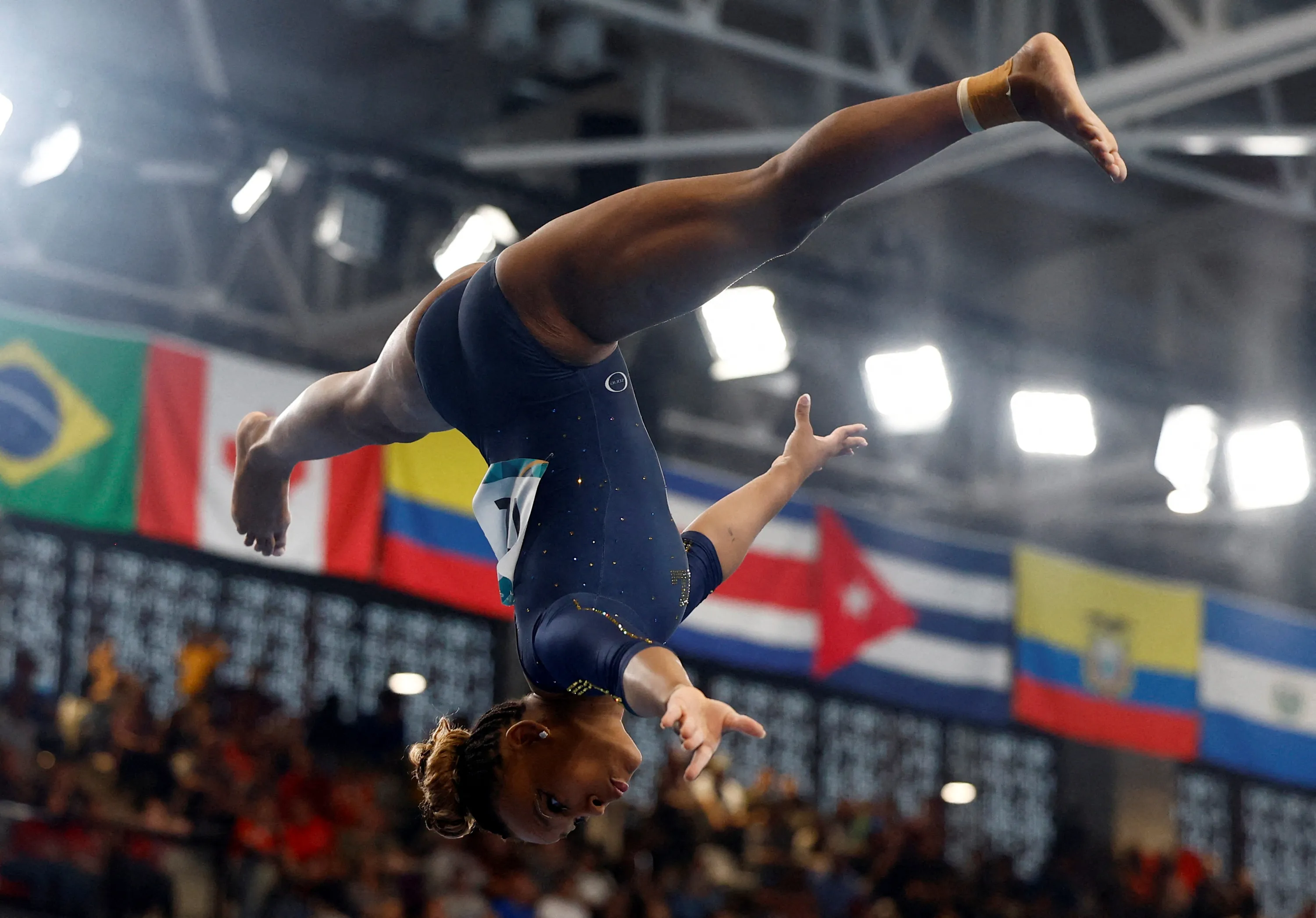 Brazil's Rebeca Andrade in action on the balance beam during the women's team final at the Pan Am Games in Santiago, Chile on October 22, 2023. (Photo by Agustin Marcarian/Reuters)