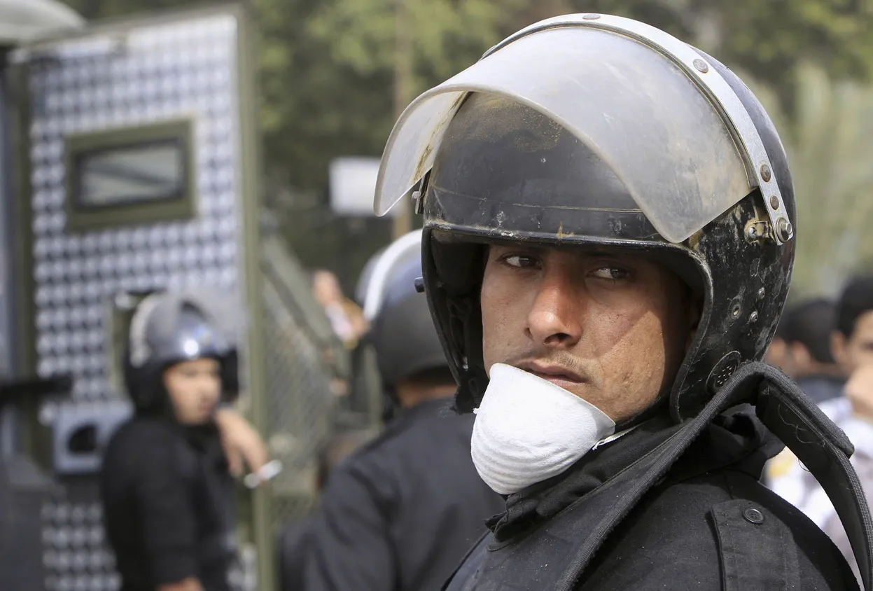 A riot police officer looks on during clashes between protesters opposing Egyptian President Mohamed Morsi, and riot police with other Egyptians fighting alongside them, along Qasr Al Nil bridge, in Cairo, on January 27, 2013. (Photo by Mohamed Abd El Ghany/Reuters via The Atlantic)