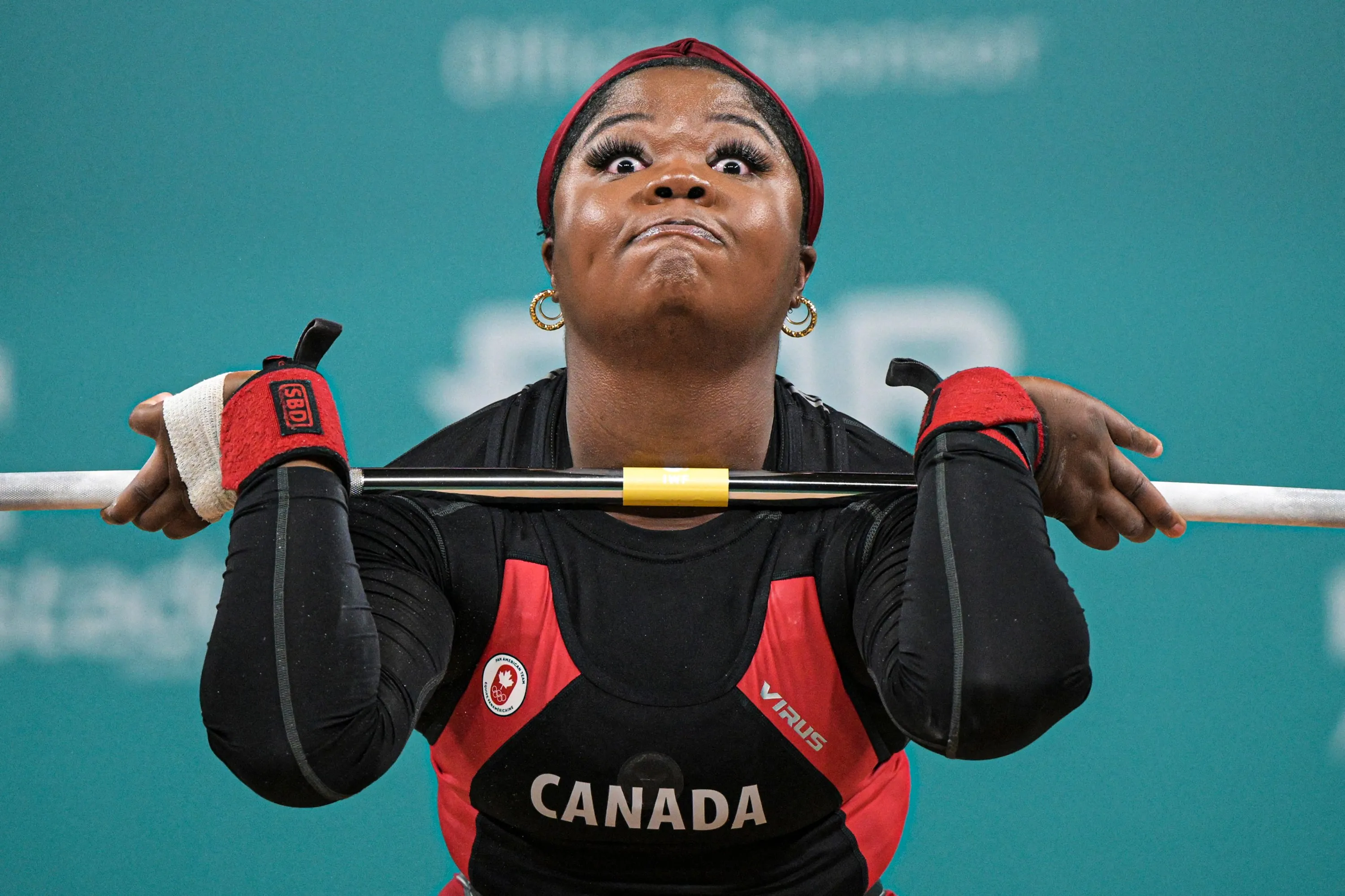 Canada's Maya Laylor competes in the women's 81kg weightlifting clean and jerk event of the Pan American Games Santiago 2023, at the Chimkowe Gymnasium in Santiago on October 23, 2023. (Photo by Ernesto Benavides/AFP Photo)