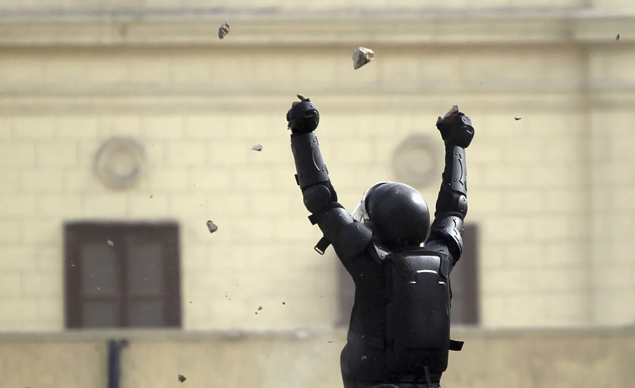 A riot police officer gestures a during clashes with protesters throwing stones at him along Sheikh Rihan street near Tahrir Square, on January 25, 2013. (Photo by Amr Abdallah Dalsh/Reuters via The Atlantic)
