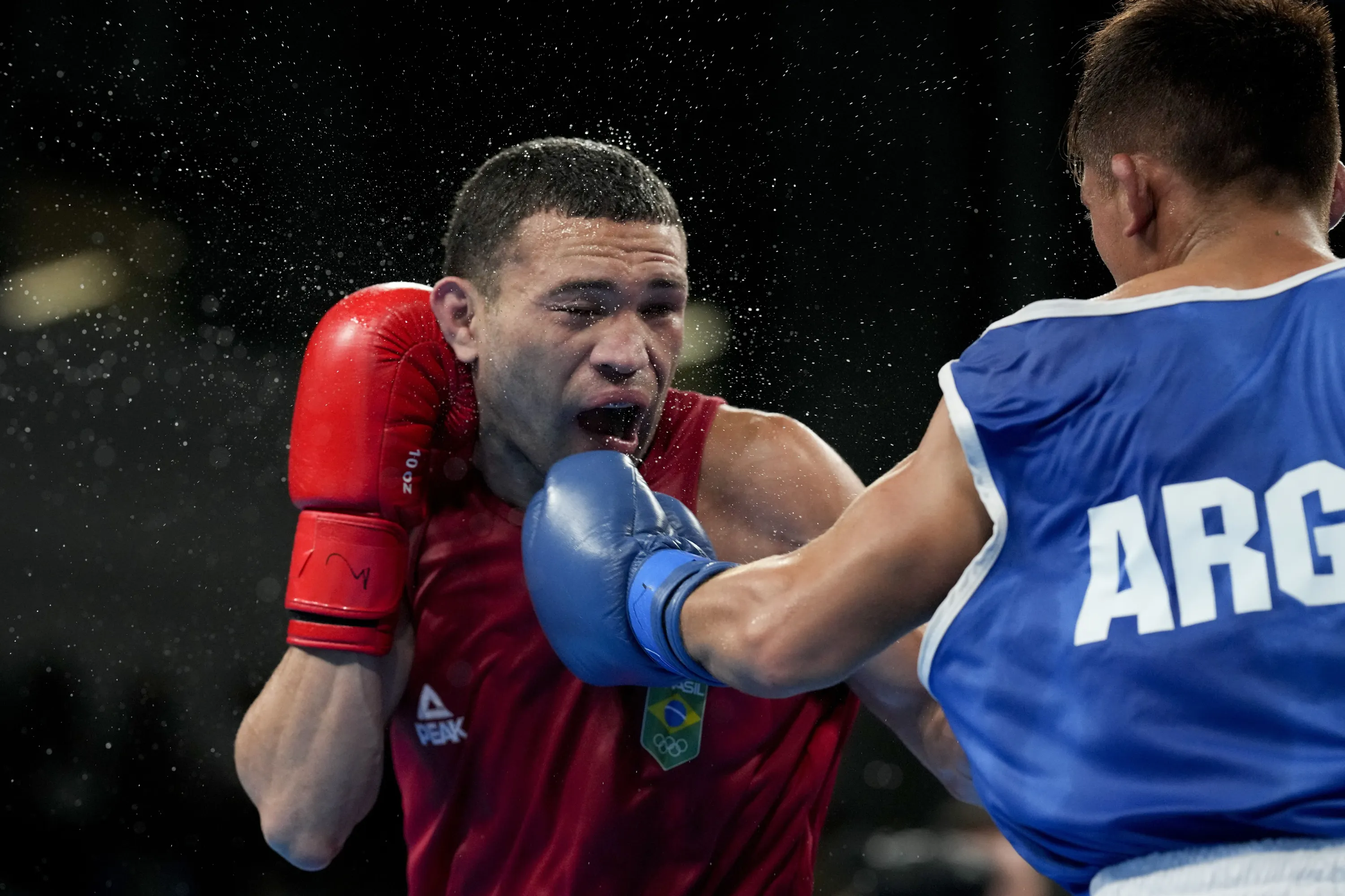 Brazil's Michael Da Silva, left, and Argentina's Ramon Quiroga fight in a men's boxing 51kg semifinal at the Pan American Games in Santiago, Chile, Thursday, October 26, 2023. (Photo by Martin Mejia/AP Photo)
