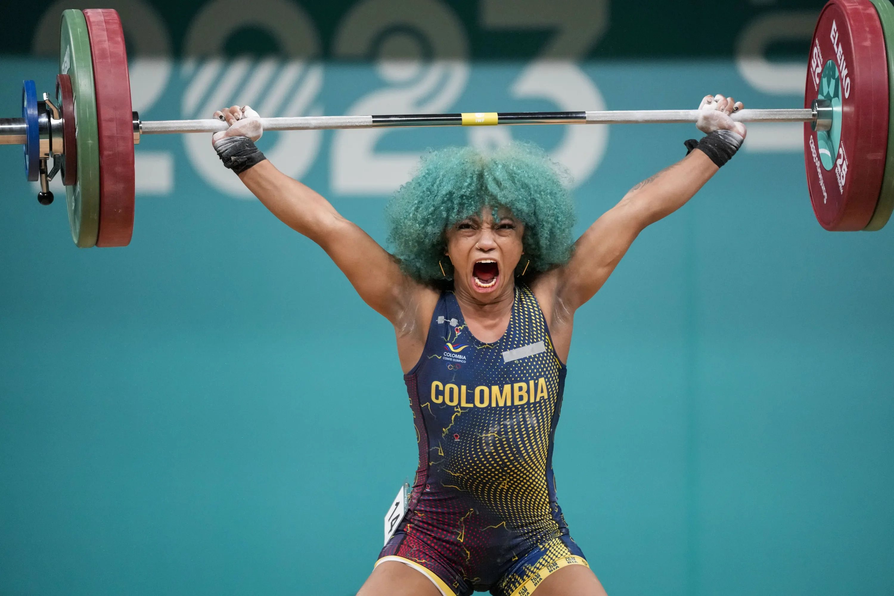 Colombia's Concepcion Usuga competes in women's weightlifting 59Kg at the Pan American Games in Santiago, Chile, Sunday, October 22, 2023. (Photo by Moises Castillo/AP Photo)