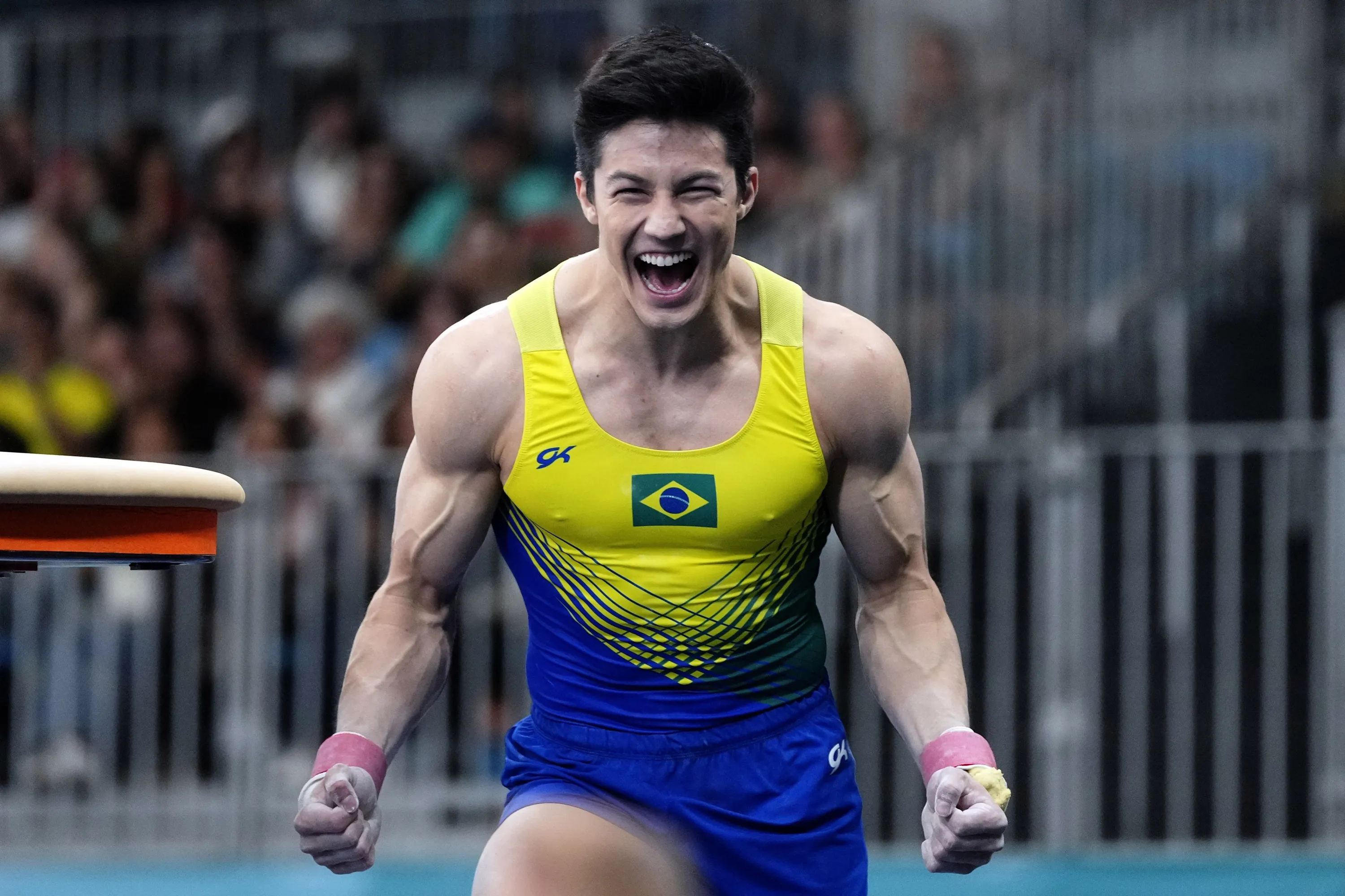 Brazil's Arthur Mariano celebrates after competing in the men's gymnastics vault exercise final at the Pan American Games in Santiago, Chile, Wednesday, October 25, 2023. Chile is hosting the Olympic-style event for the first time. (Photo by Martin Mejia/AP Photo)