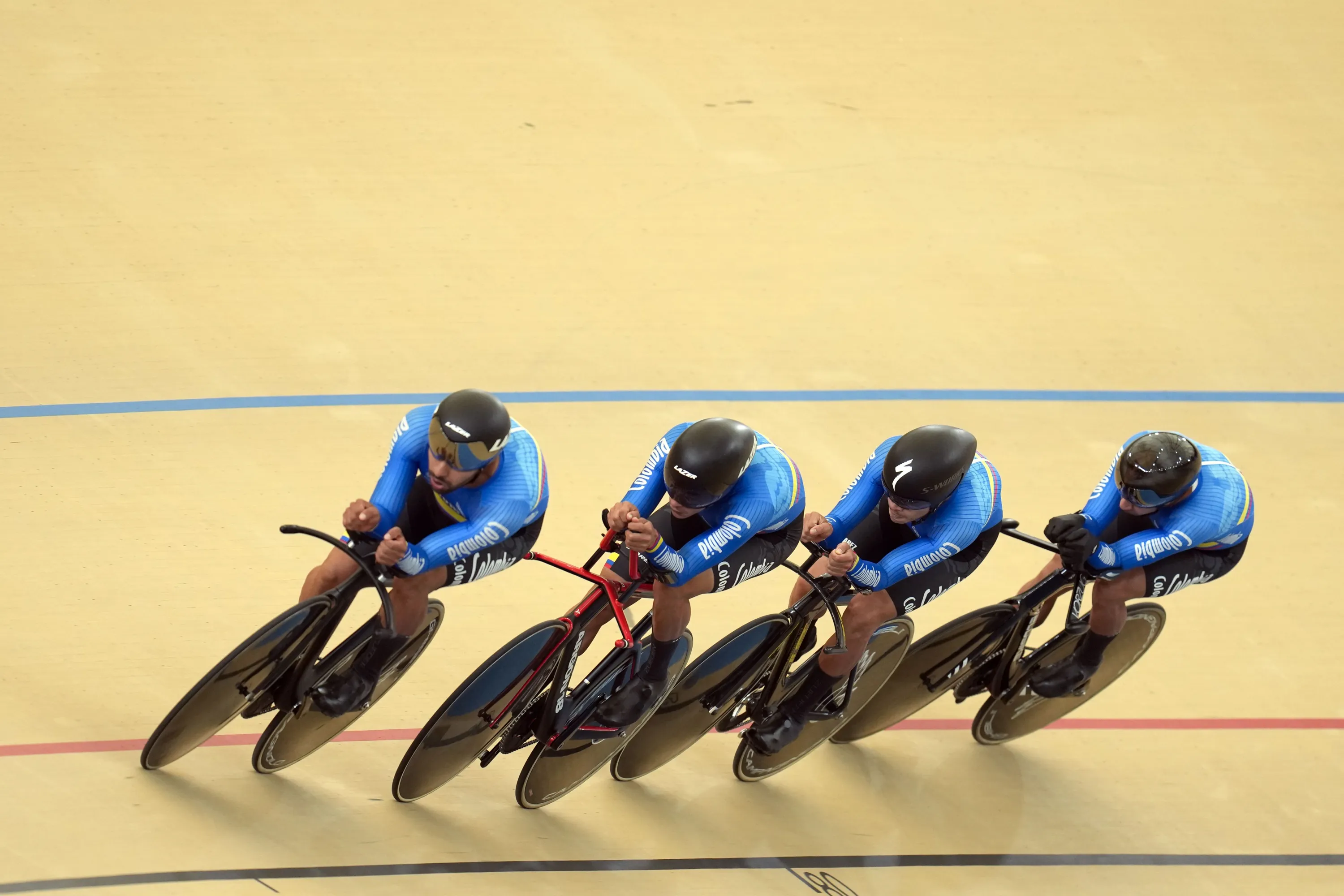 Colombia's cyclers Brayan Sanchez, Jordan Parra, Juan Arango and Nelson Soto ride during the men's team pursuit qualifiers at the Pan American Games in Santiago, Chile, Thursday, October 26, 2023. (Photo by Fernando Vergara/AP Photo)