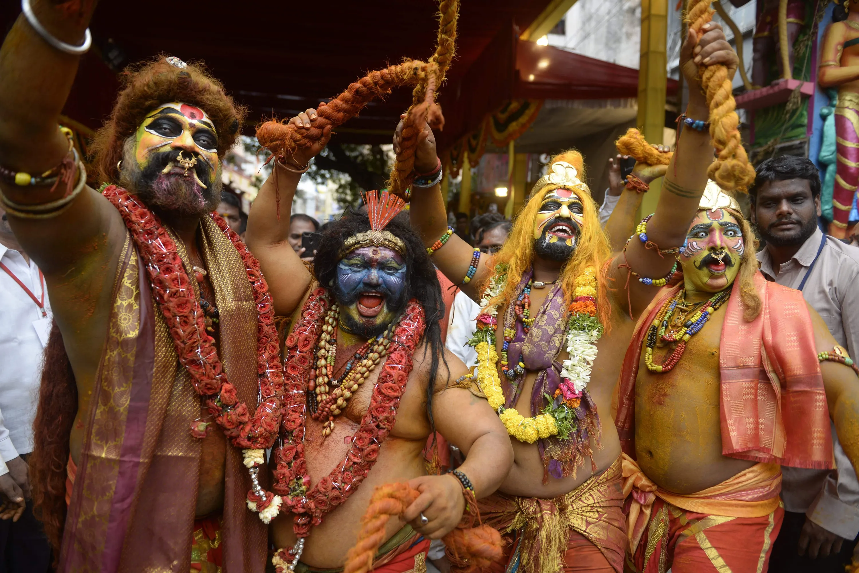 Hindu devotees dressed as Potharaju, the brother of the Hindu goddess Mahakali, perform during the Bonalu festival procession at the Sri Ujjaini Mahakali Temple in Secunderabad, the twin city of Hyderabad on July 18, 2022. (Photo by Noah Seelam/AFP Photo)
