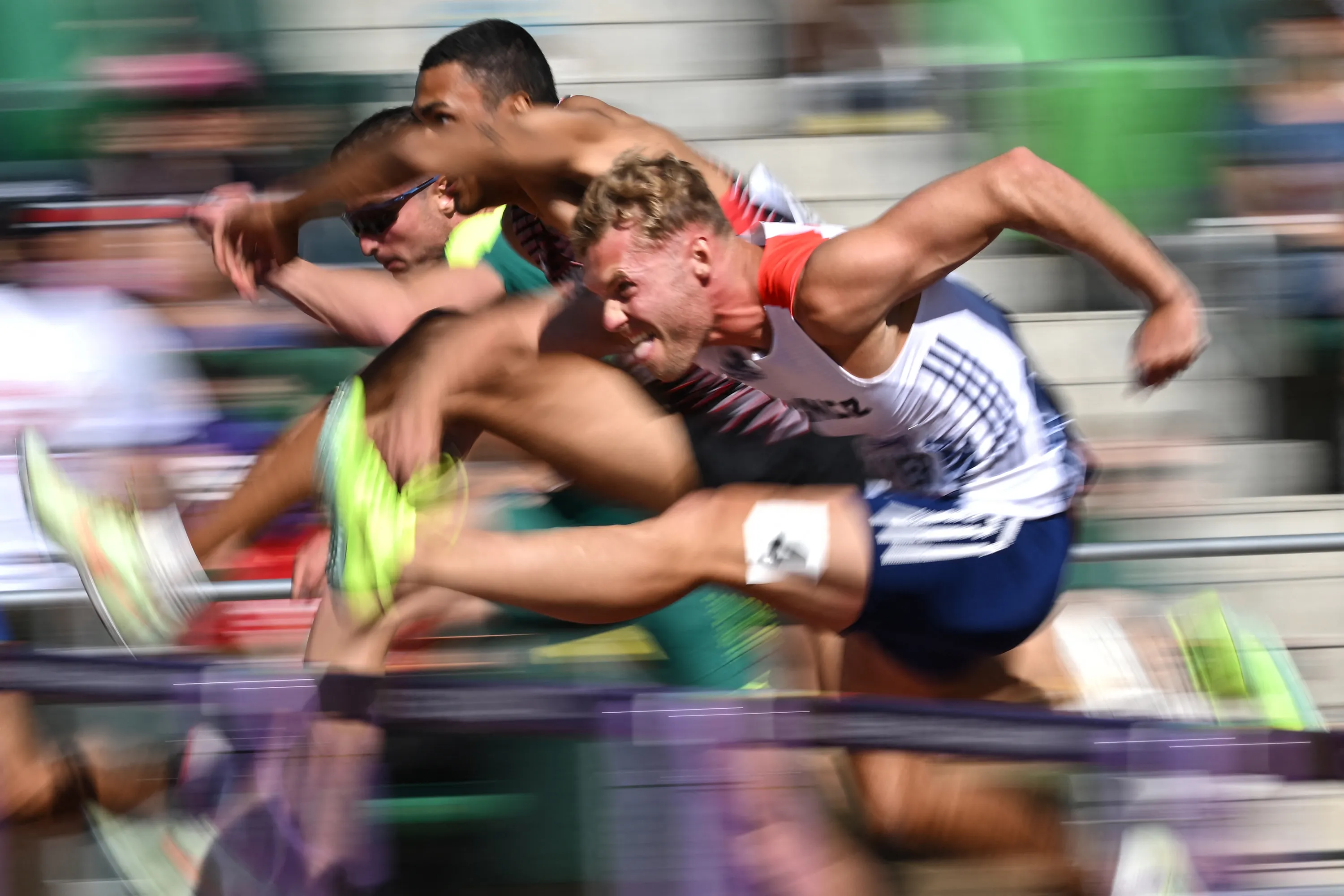 France's Kevin Mayer (R) competes in the men's 110m hurdles decathlon event during the World Athletics Championships at Hayward Field in Eugene, Oregon on July 24, 2022. (Photo by Ben Stansall/AFP Photo)