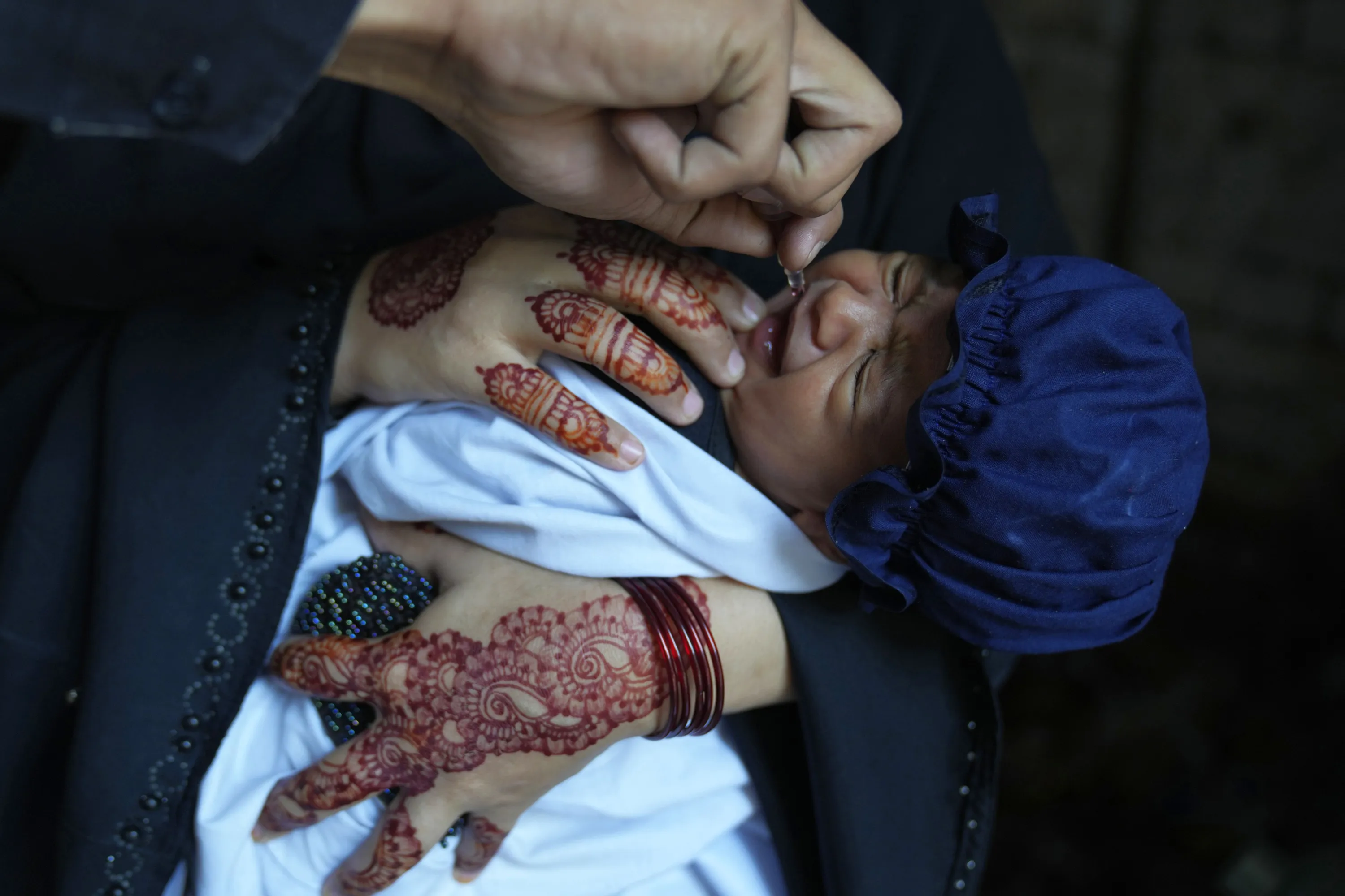 A health worker administers a polio vaccine to a child at a neighborhood of Lahore, Pakistan, Monday, October 2, 2023. (Photo by K.M. Chaudary/AP Photo)