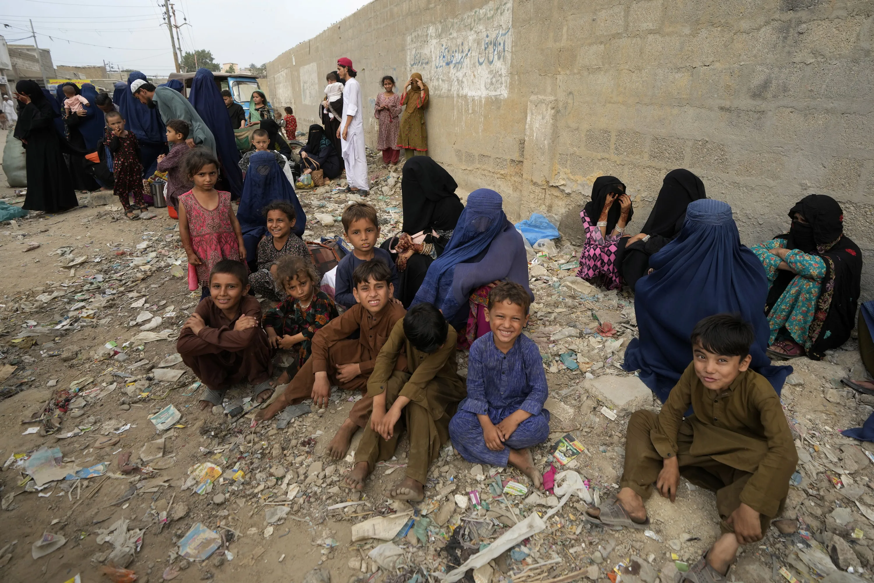 Afghan families wait to board into a bus to depart for their homeland, in Karachi, Pakistan, Friday, October 6, 2023. (Photo by Fareed Khan/AP Photo)