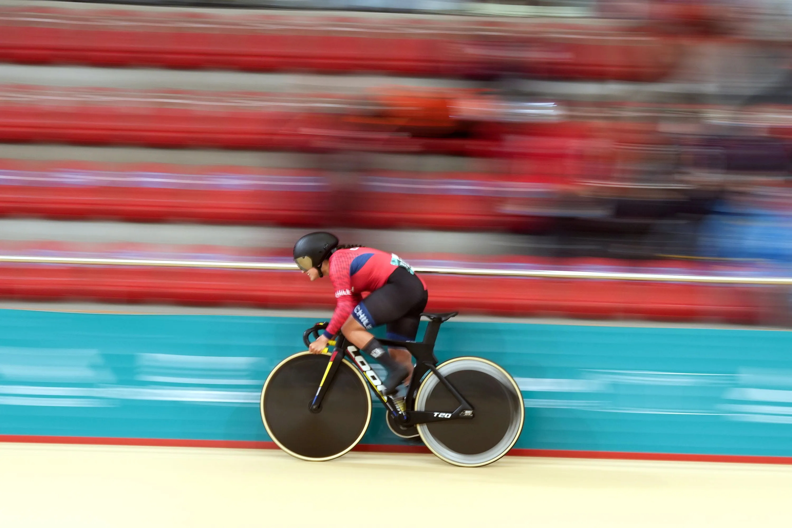 Chile's Paula Molina competes in the women's cycling track sprint qualifier at the Pan American Games in Santiago, Chile, Thursday, October 26, 2023. (Photo by Fernando Vergara/AP Photo)