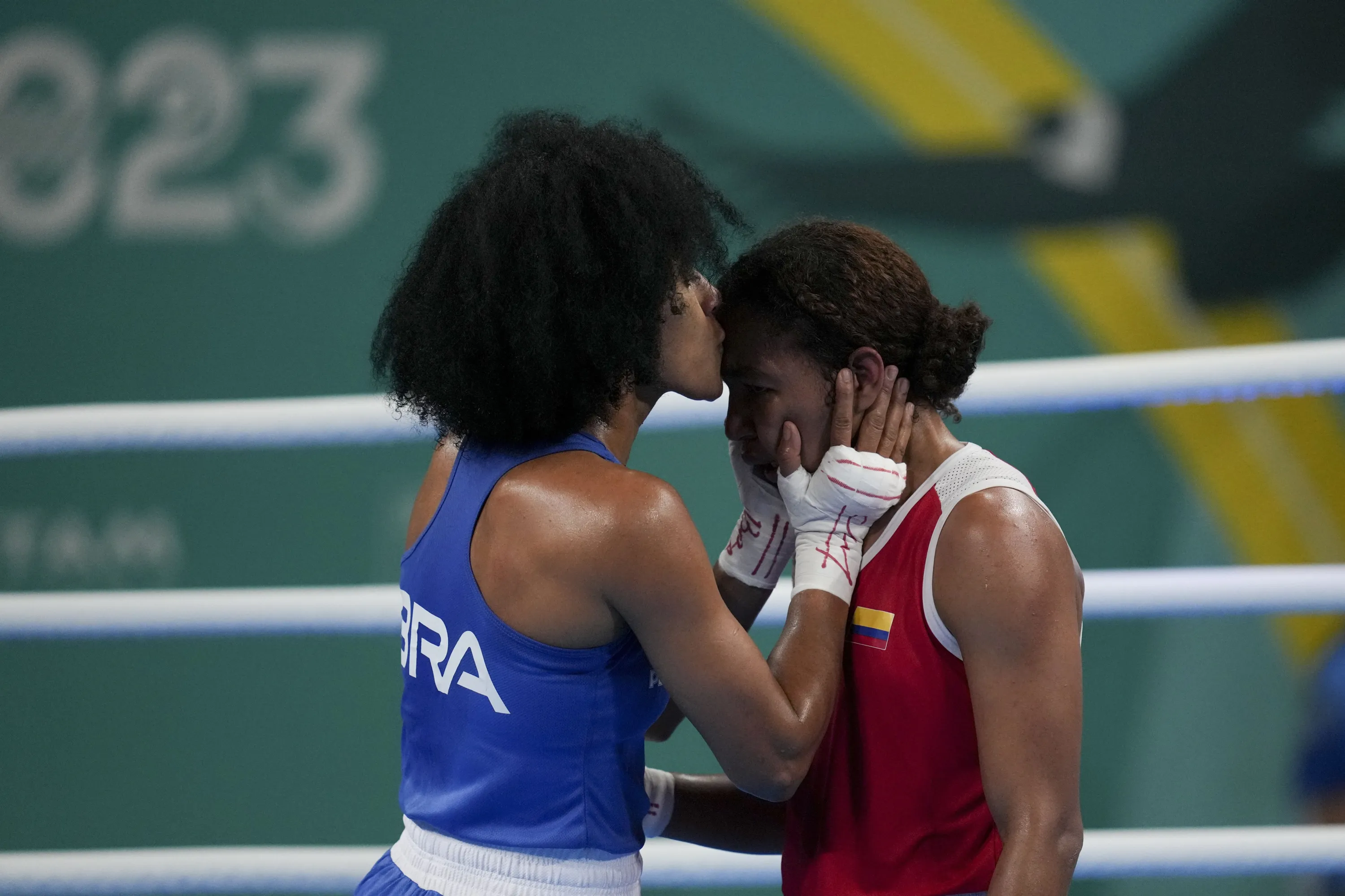 Brazil's Barbara Dos Santos, left, kisses Colombia's Camila Camilo at the end of a women's 66kg semifinal boxing bout at the Pan American Games in Santiago, Chile, Thursday, October 26, 2023. (Photo by Dolores Ochoa/AP Photo)