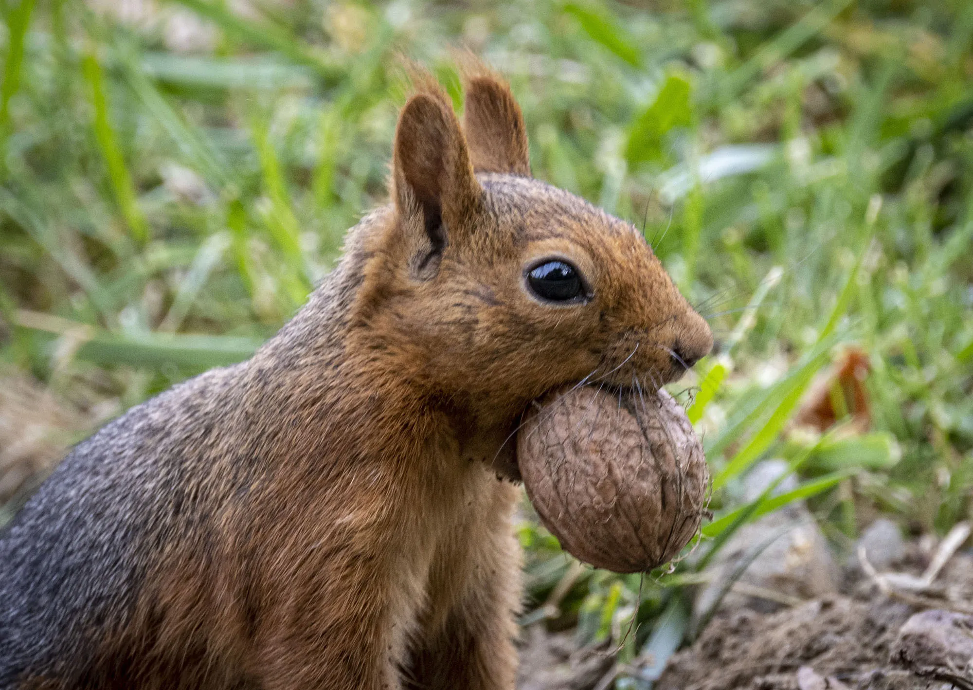 A squirrel carries a walnut among fallen leaves with the colors of the season in the parks of Cankaya district during autumn season in Ankara, Turkiye on October 25, 2023. (Photo by Emin Sansar/Anadolu via Getty Images)